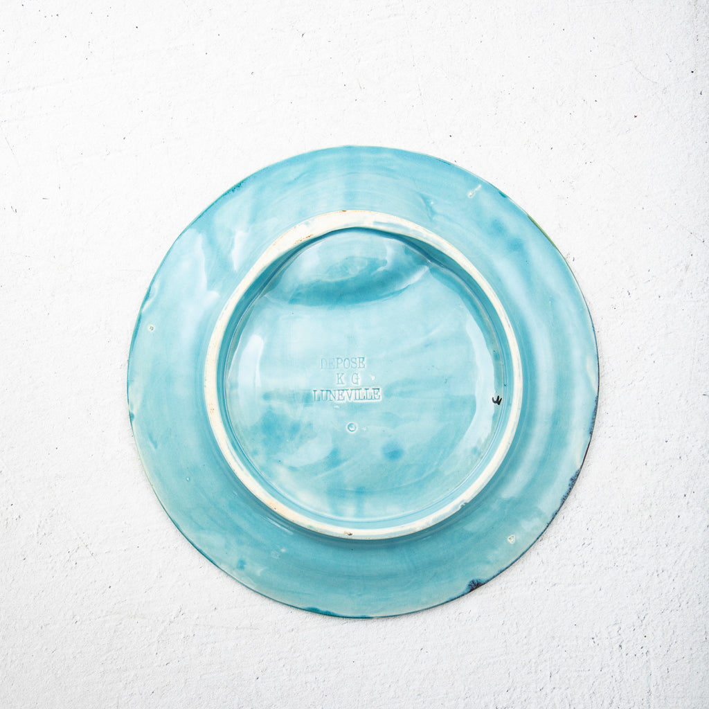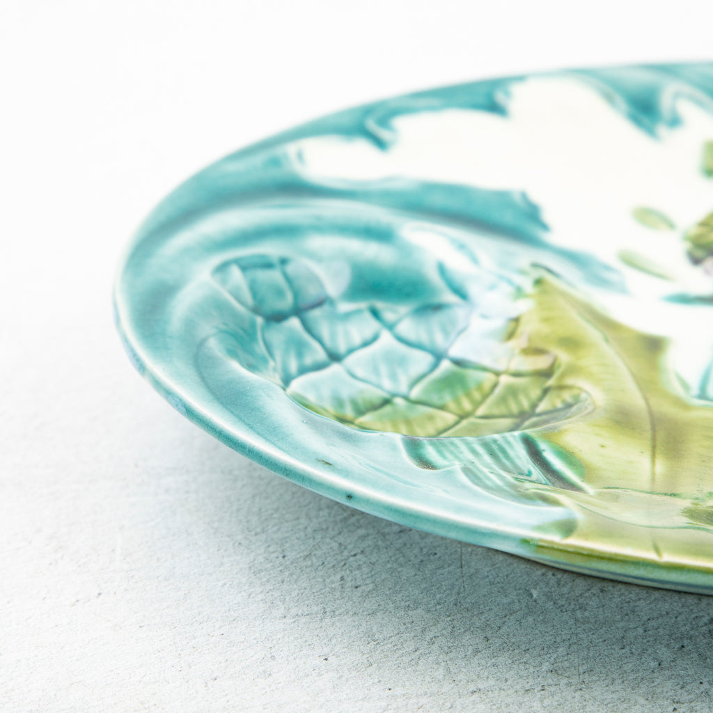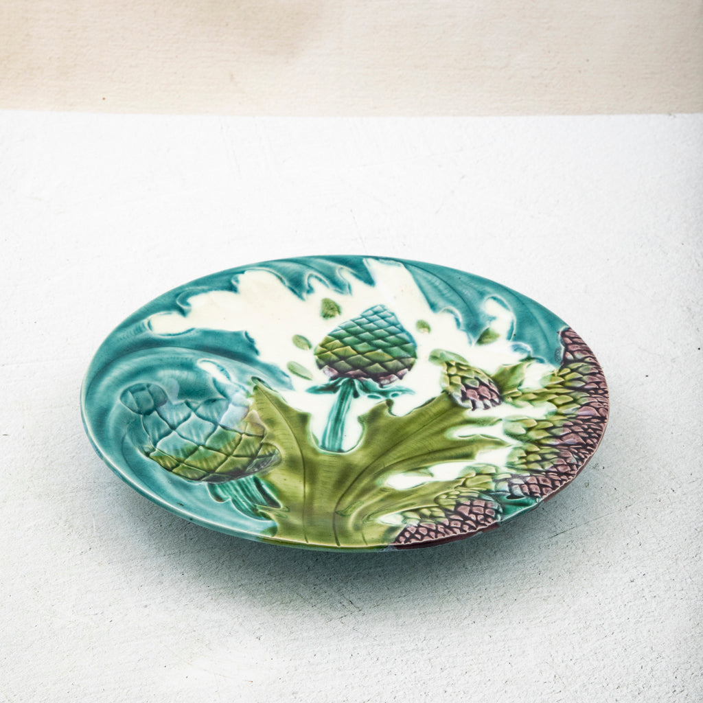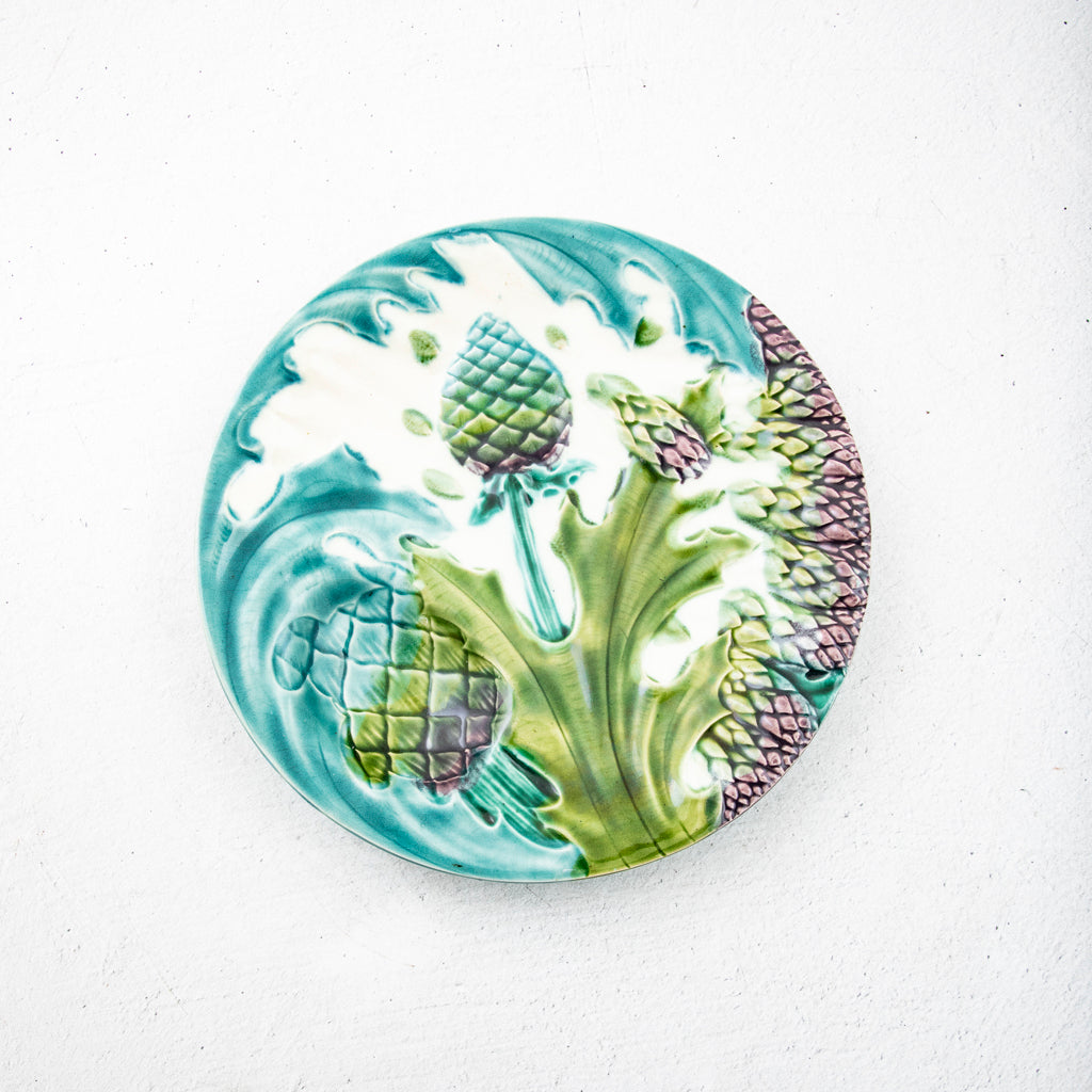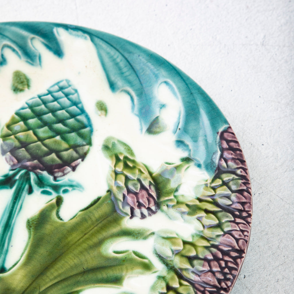 Late nineteenth century Majolica plate with asparagus and artichokes. 9" Diameter