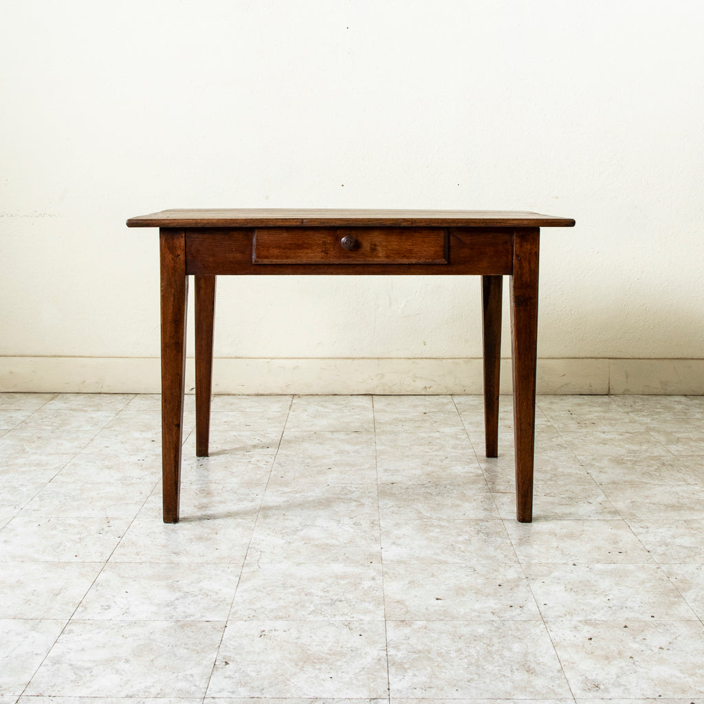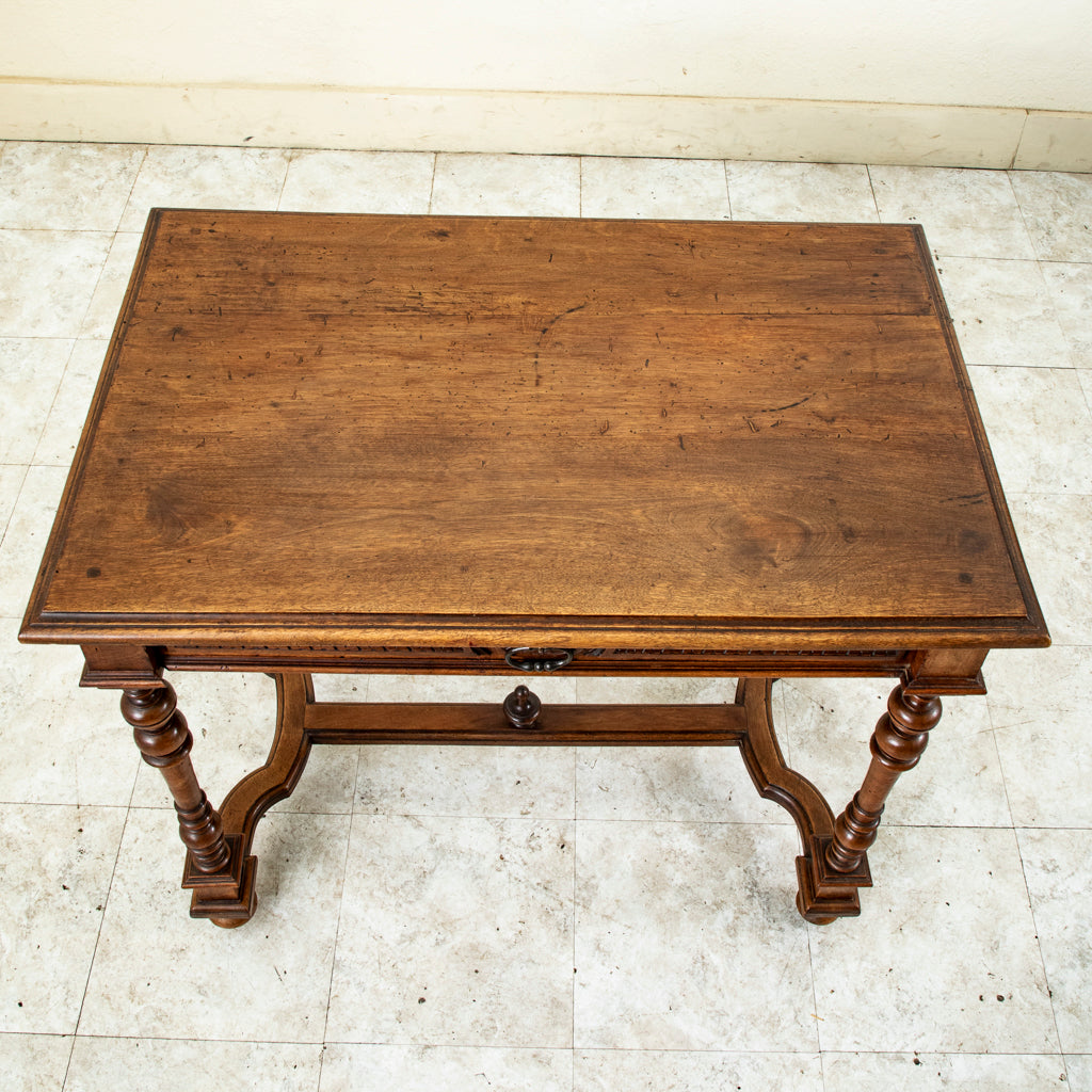 Late nineteenth century Henri II style hand pegged walnut writing table with turned legs and H stretcher. Single drawer with iron handle, c. 1880. 29.5" H X 39.25" W...