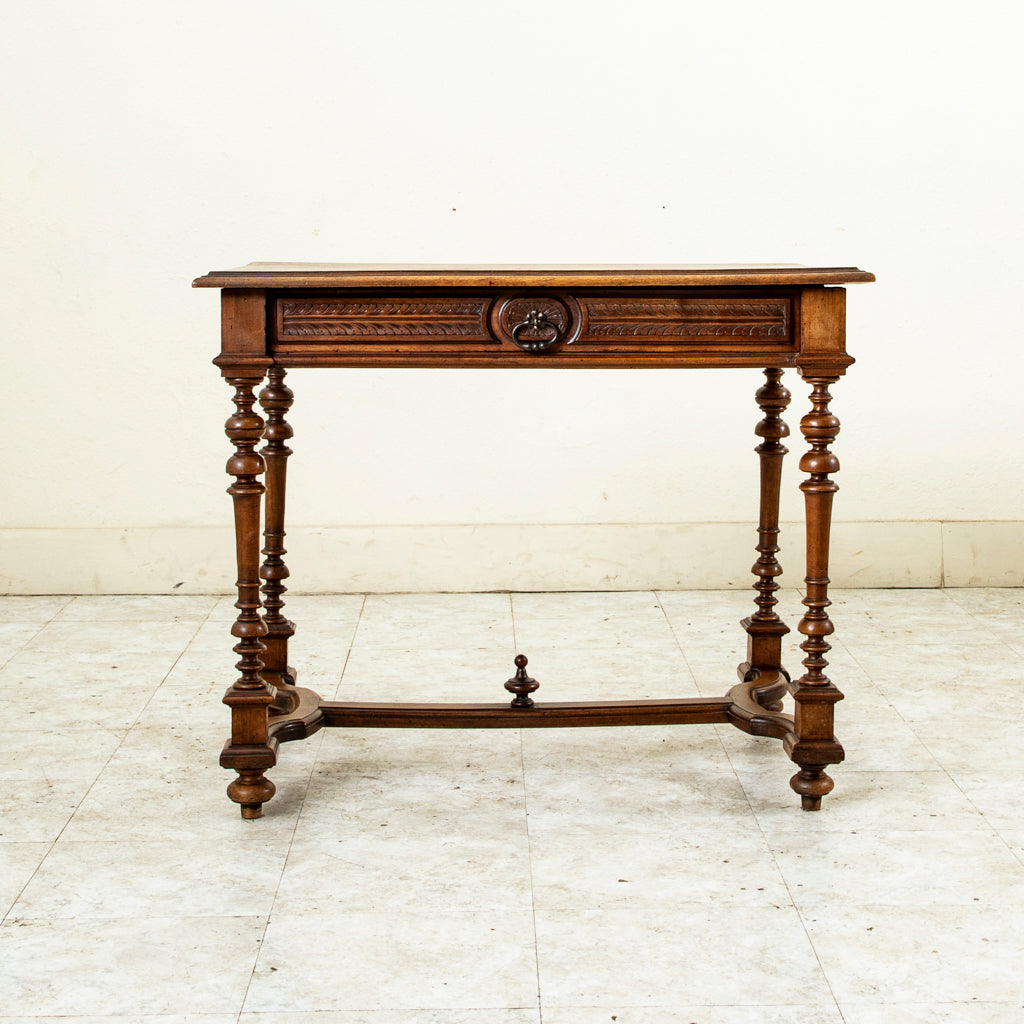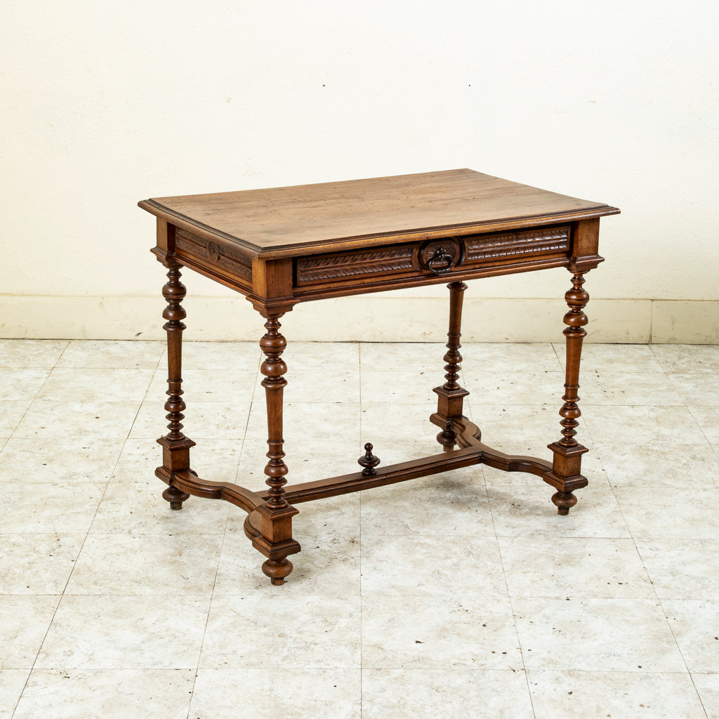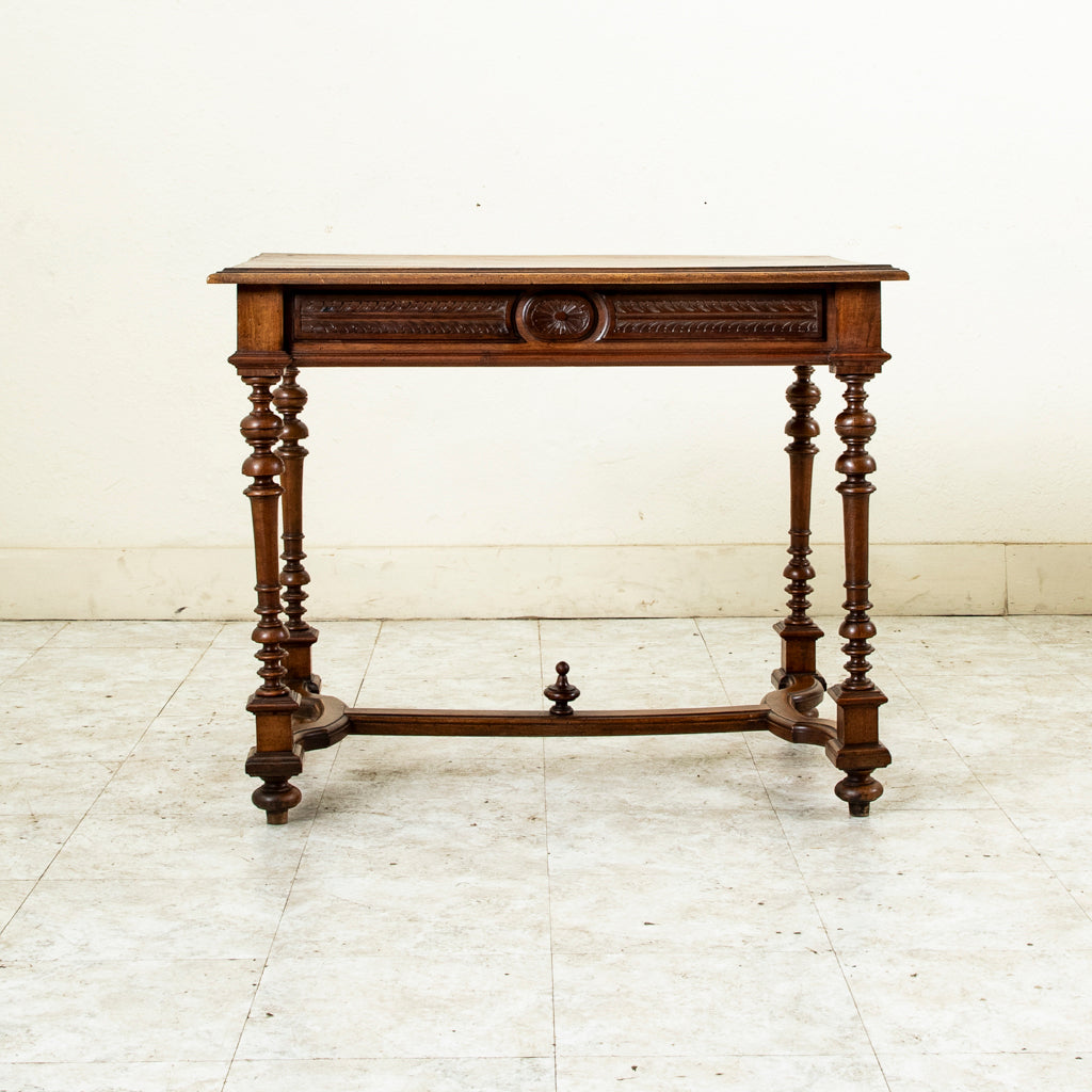 Late nineteenth century Henri II style hand carved walnut writing table with single drawer and H stretcher, c. 1890. 29" H X 35.5" W X 23.25" D 23.75" floor...