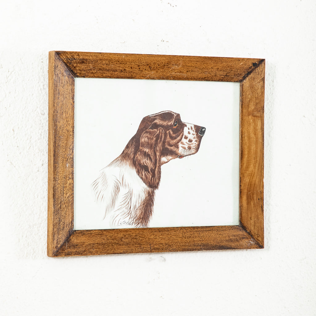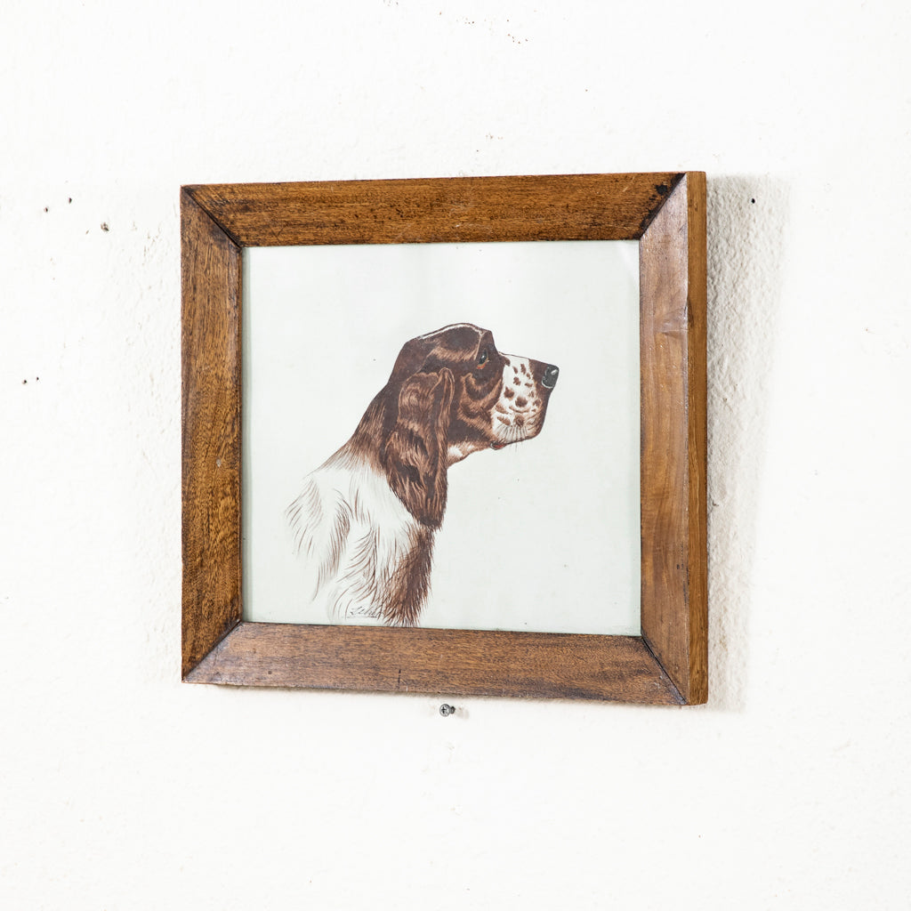 Framed watercolor of dog, c. 1900. Brittany spaniel. Signed by the artist. 12.25" H X 15" W framed