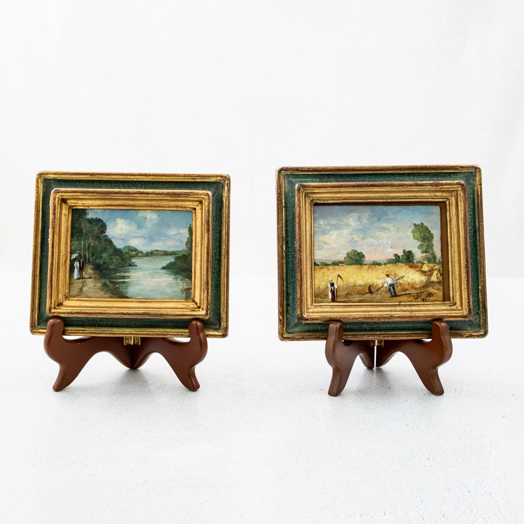 Pair of framed oil paintings on panel. Pastoral scenes. 5.5" H X 6.5" W