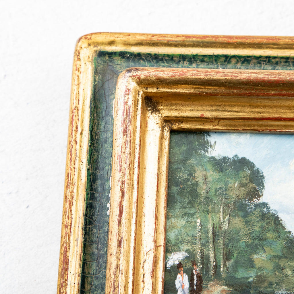 Late nineteenth century oil on panel in gilt wood frame. Landscape scene with bridge over a river leading to a chateau. 15" H X 21" W framed 9.5" H...
