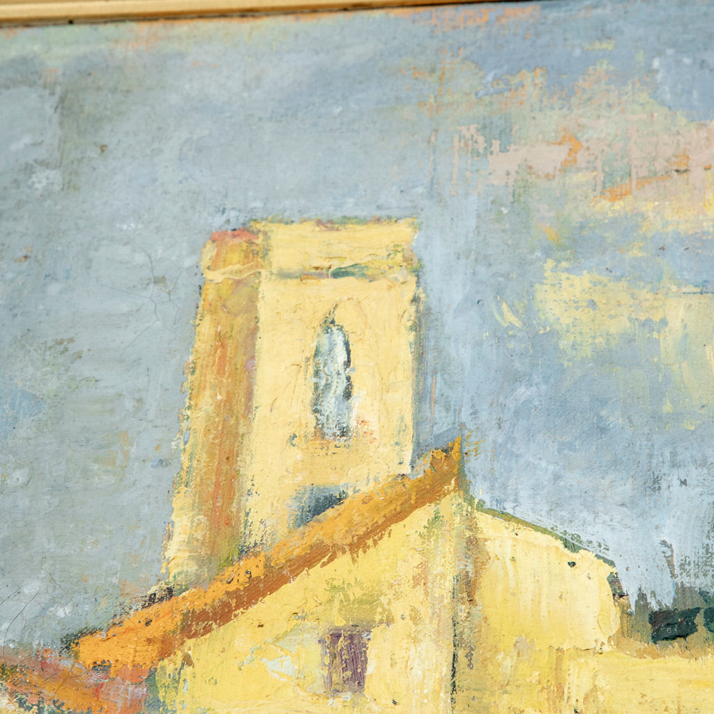 Twentieth century unframed oil painting on artboard. Landscape scene with French house and terrace. 10.5" H X 13.5" W