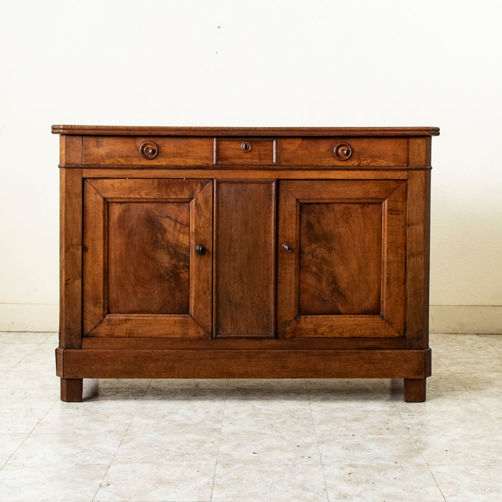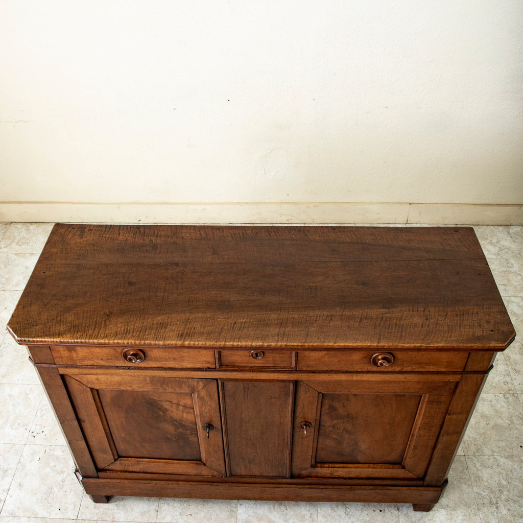 Nineteenth century Louis Philippe period walnut buffet with three drawers, two doors, and two interior shelves. Includes two keys. c. 1830-1848. 39.25" H X 55.5" W X 20" D ...