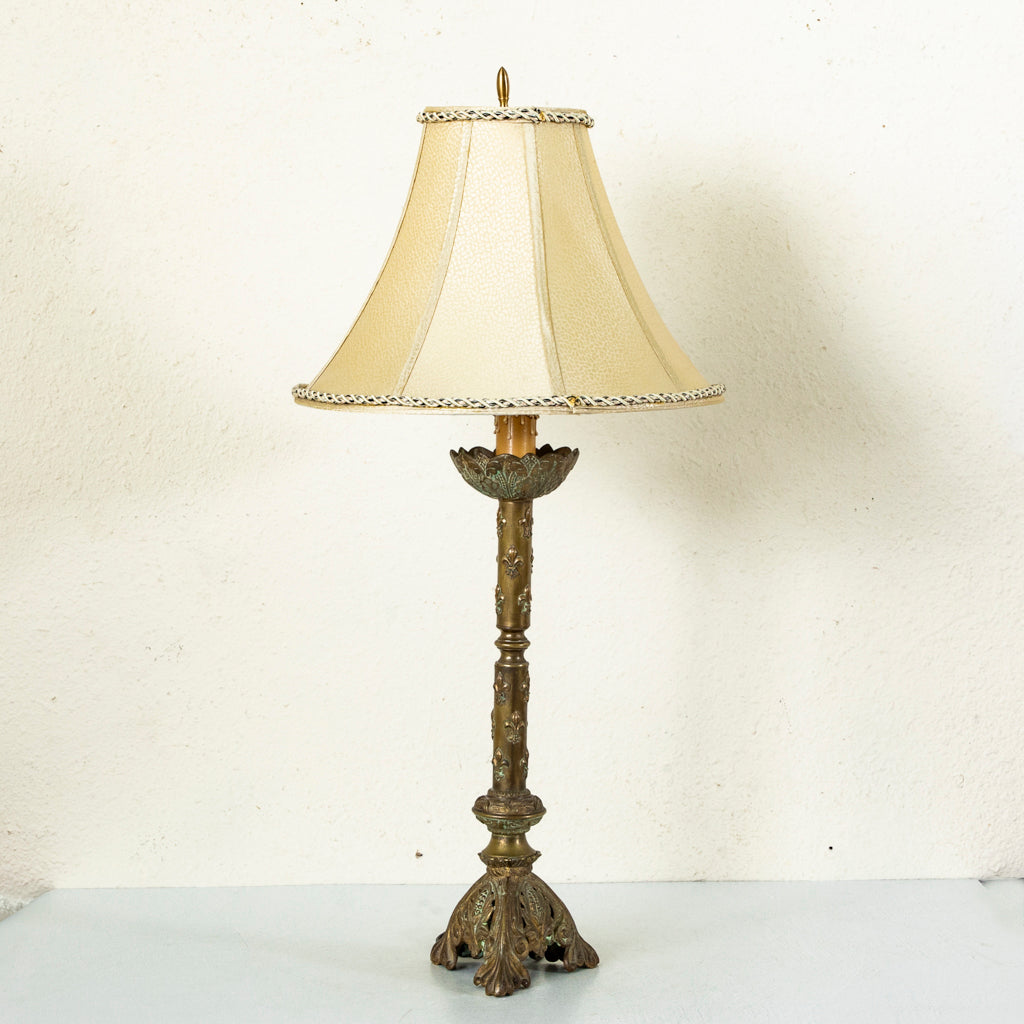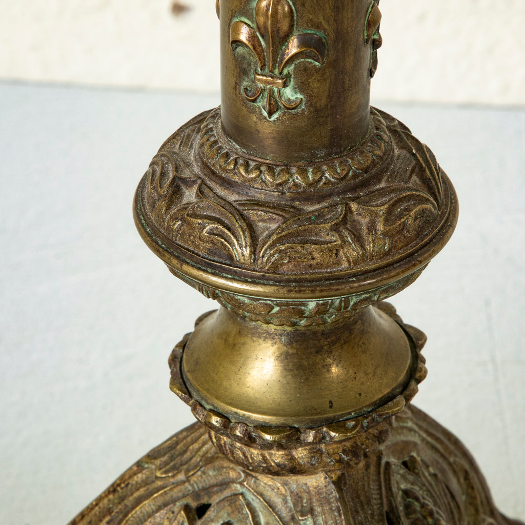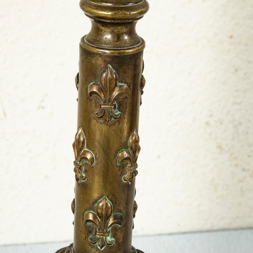 Late nineteenth century brass candlestick or pricket with fleur de lys. Originally used on the altar of a church. Converted into a lamp. Wired to American standards. 35" H...