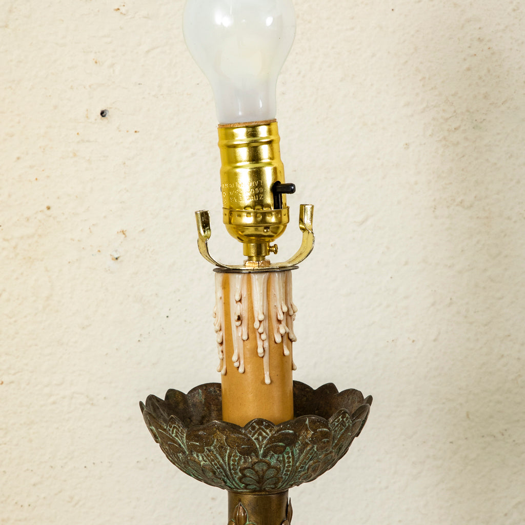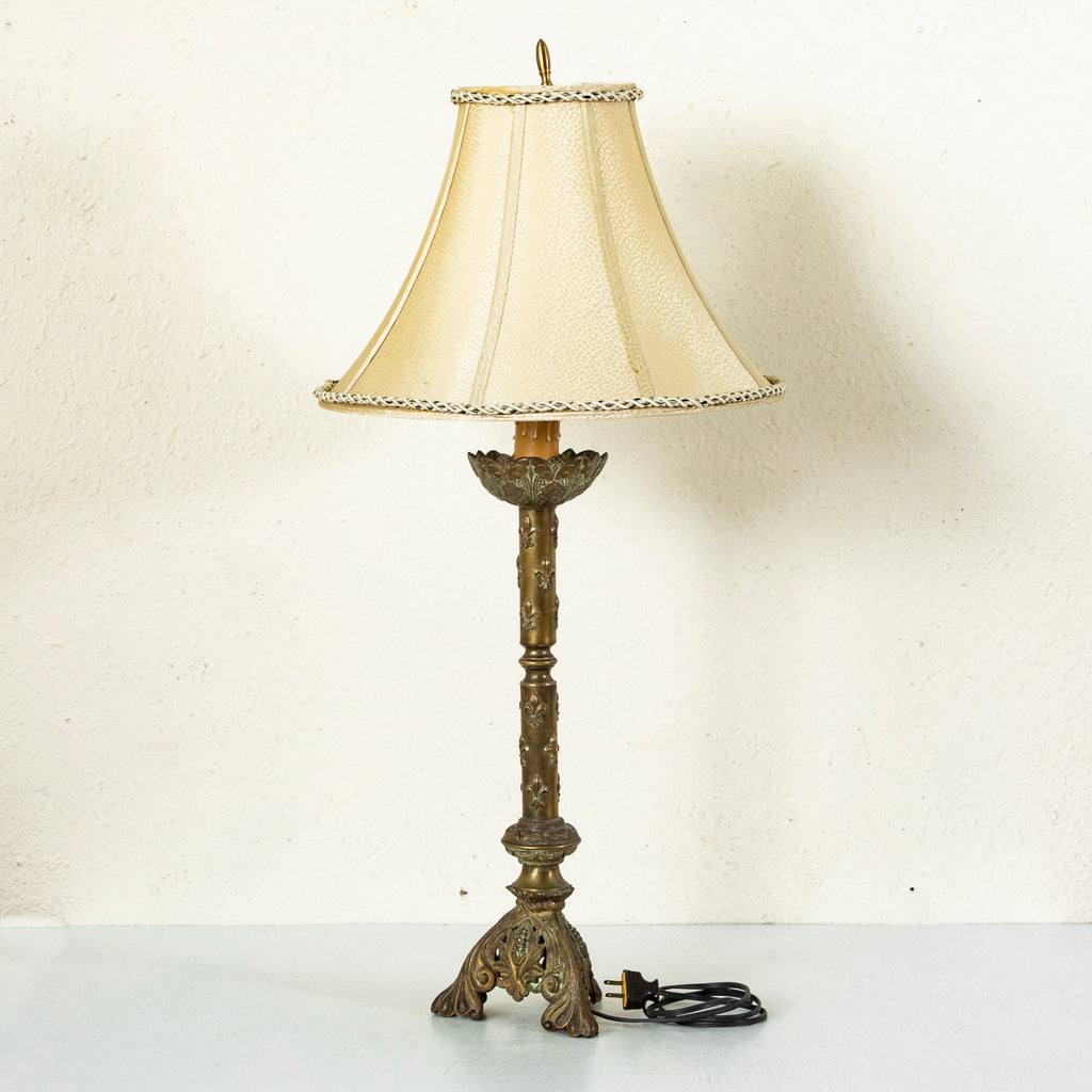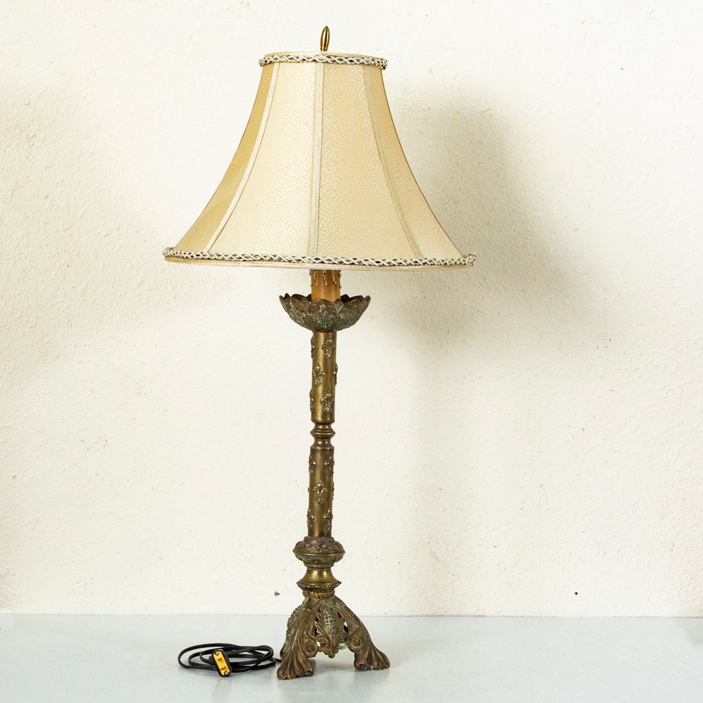 Late nineteenth century brass candlestick or pricket with fleur de lys. Originally used on the altar of a church. Converted into a lamp. Wired to American standards. 35" H...