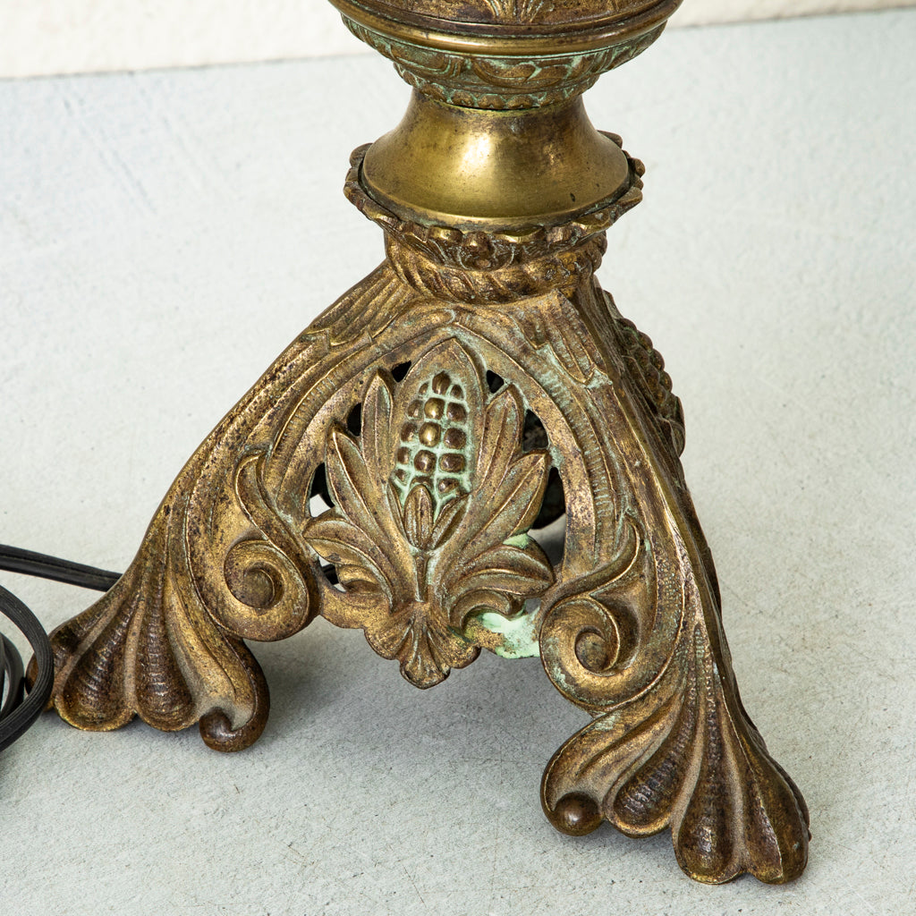 Brass Art Nouveau piano lamp with three petaled flower base, c. 1900. 9.5" H X 5.5" W X 5.25" D