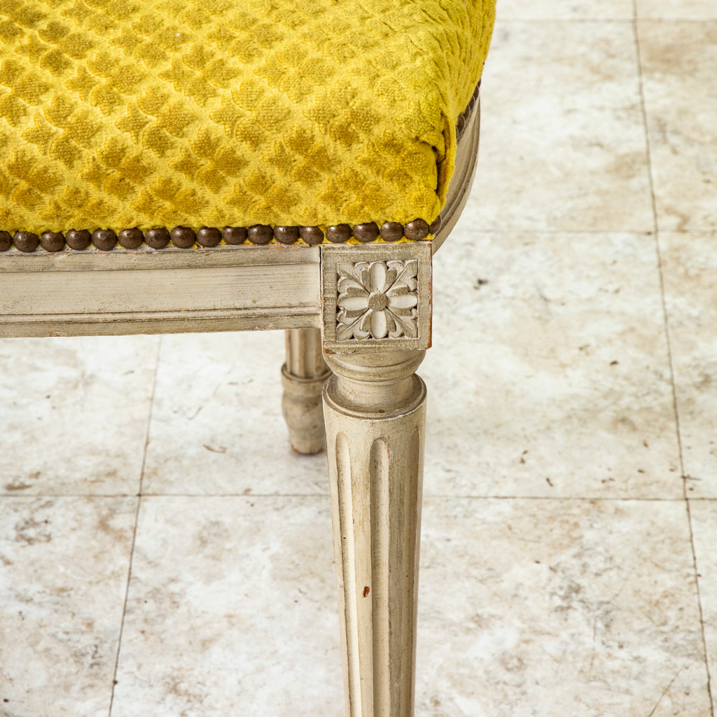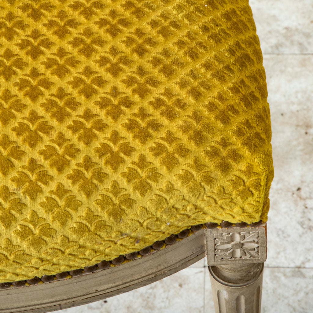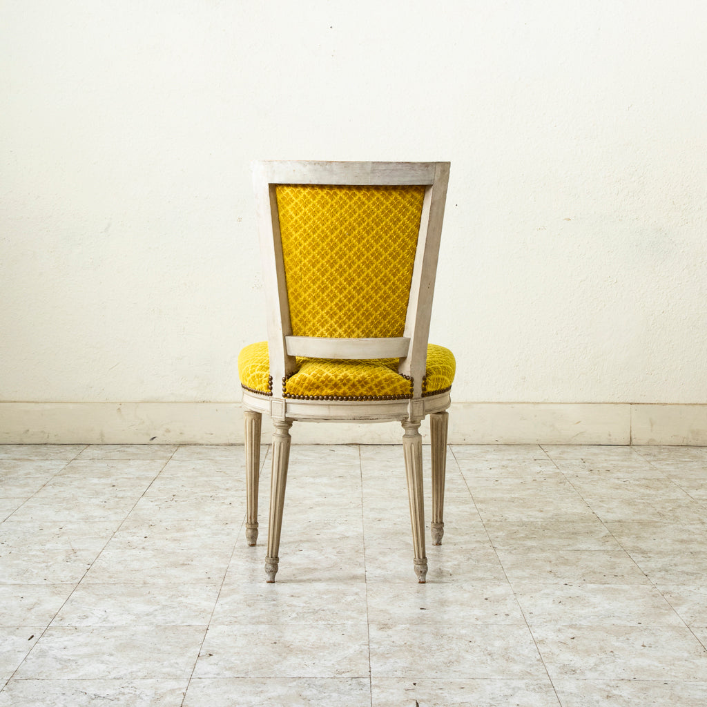 Set of six mid-twentieth century painted Louis XVI style side chairs upholstered in yellow velvet with nail head trim. c. 1940.
