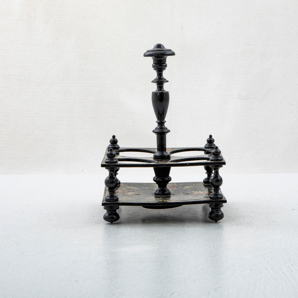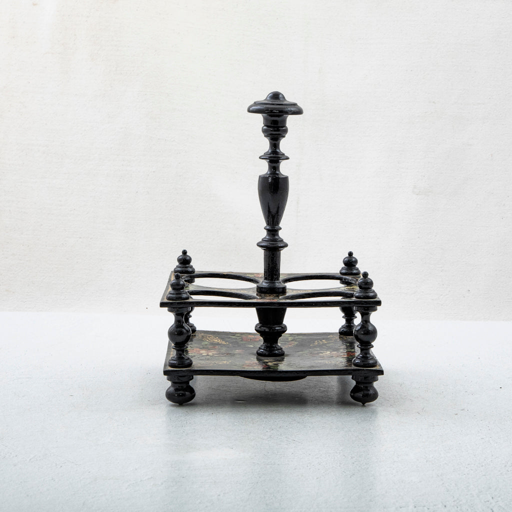 Napoleon III period painted papier mache crumber, c. 1860. Used to brush crumbs off the table. 2.5" H X 12" X 10.25" D tray 13" L brush