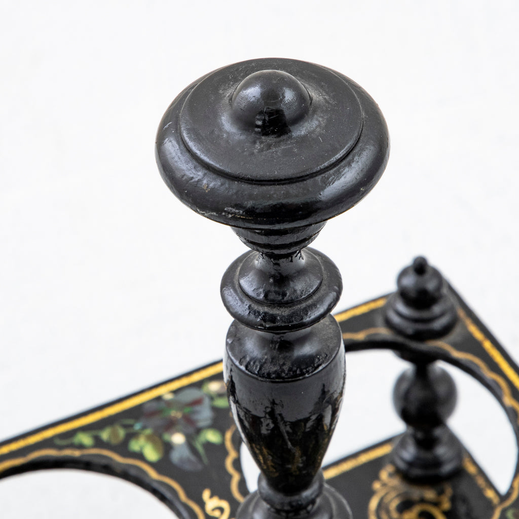 Nineteenth century Napoleon III period ebonized wooden floor easel with hand painted gold detailing and adjustable tray, c. 1860. 72" H X 27.75" W