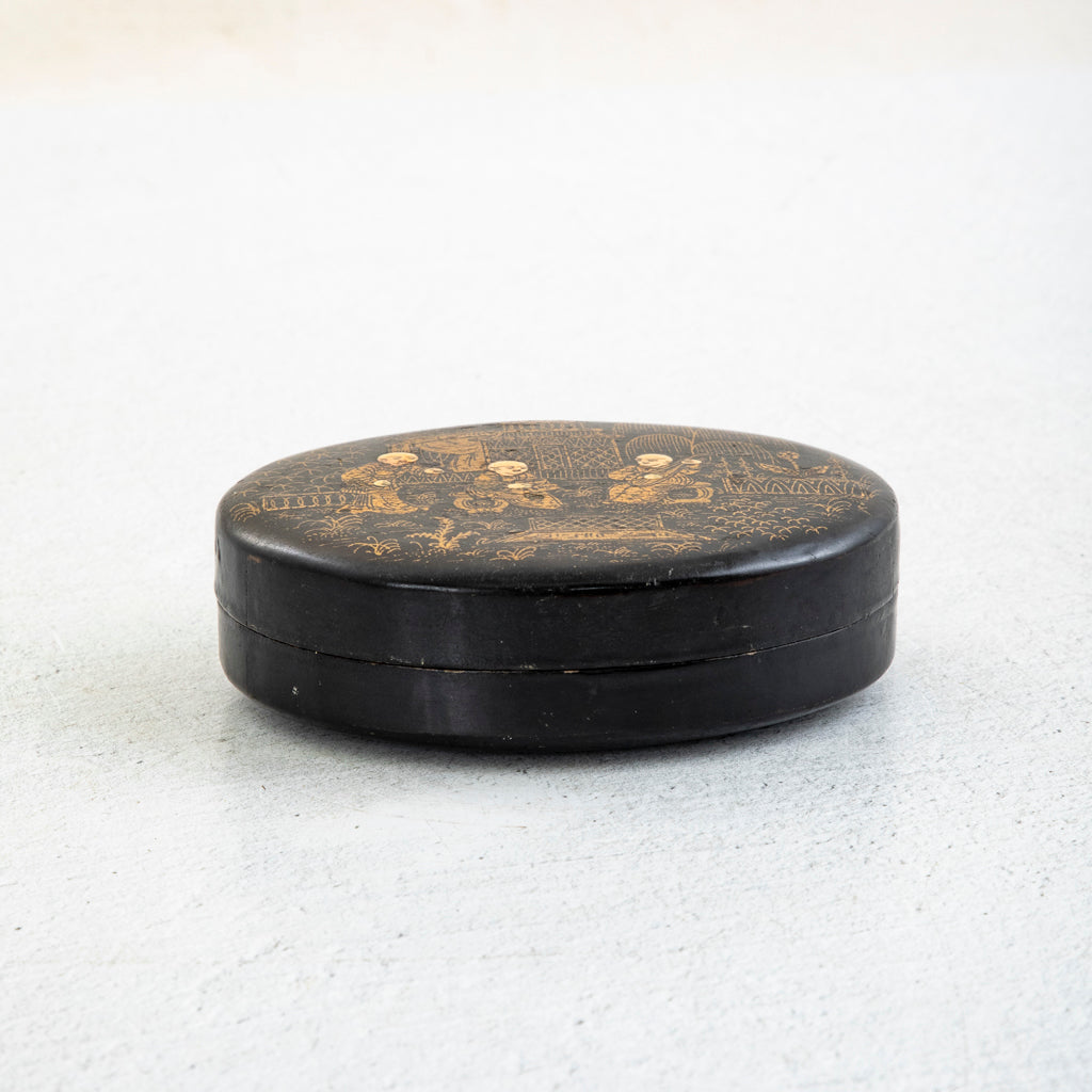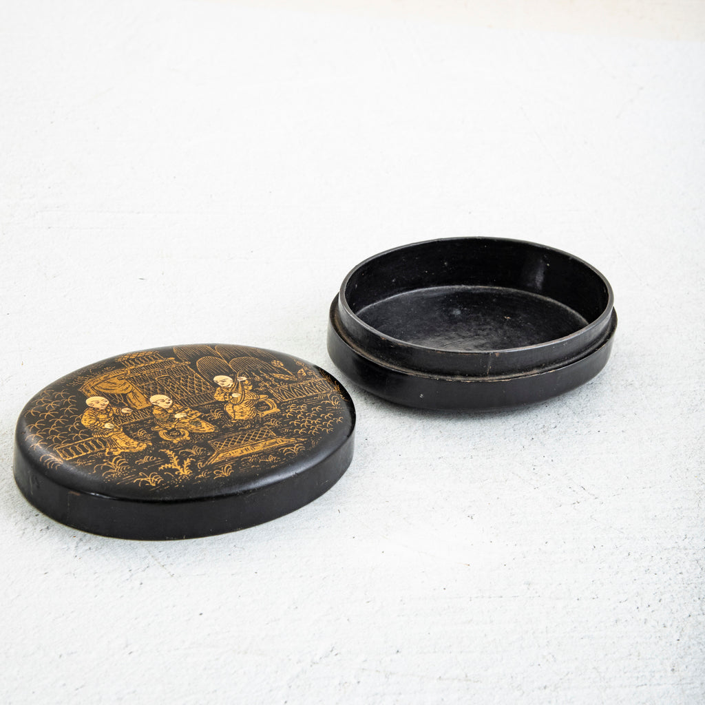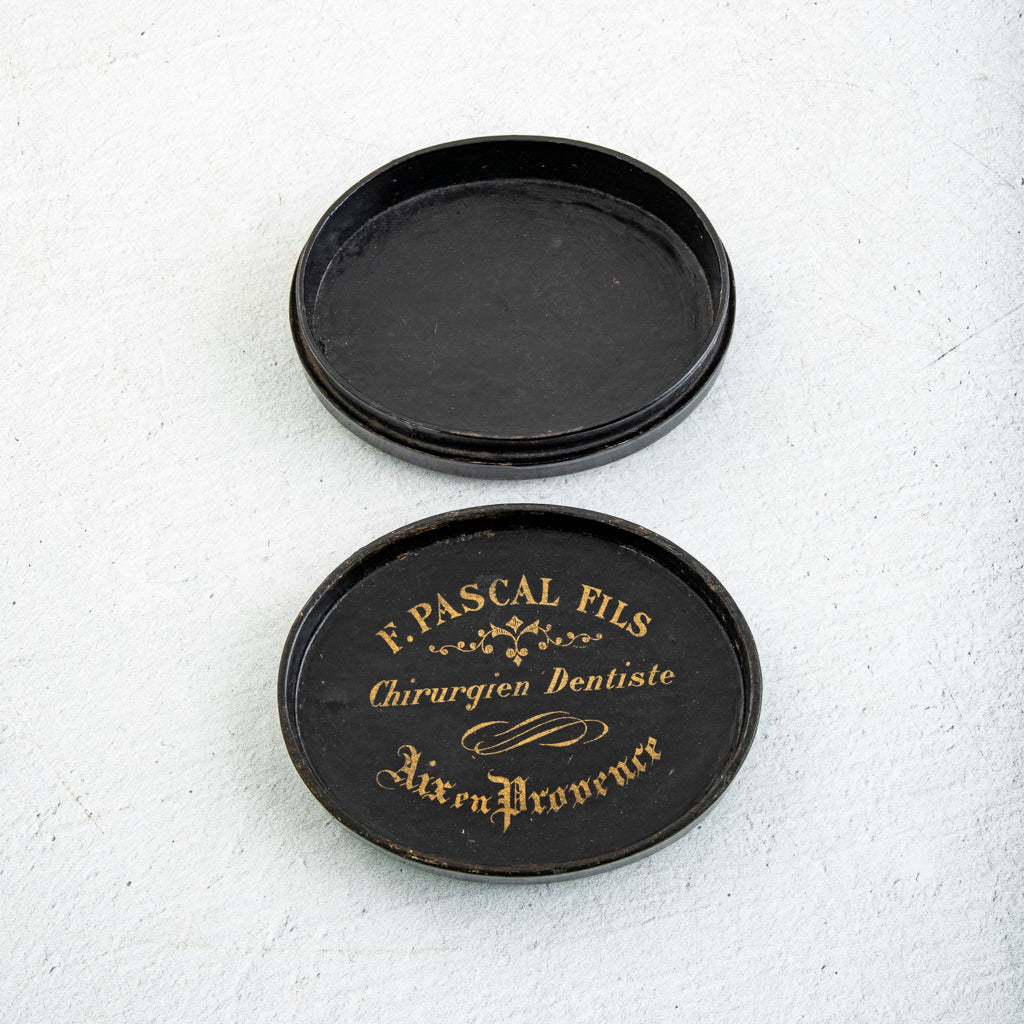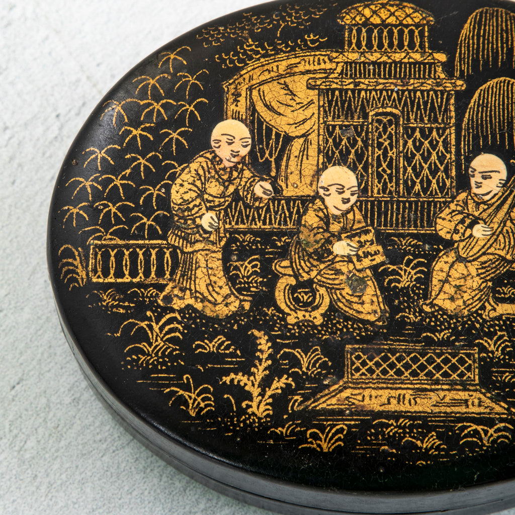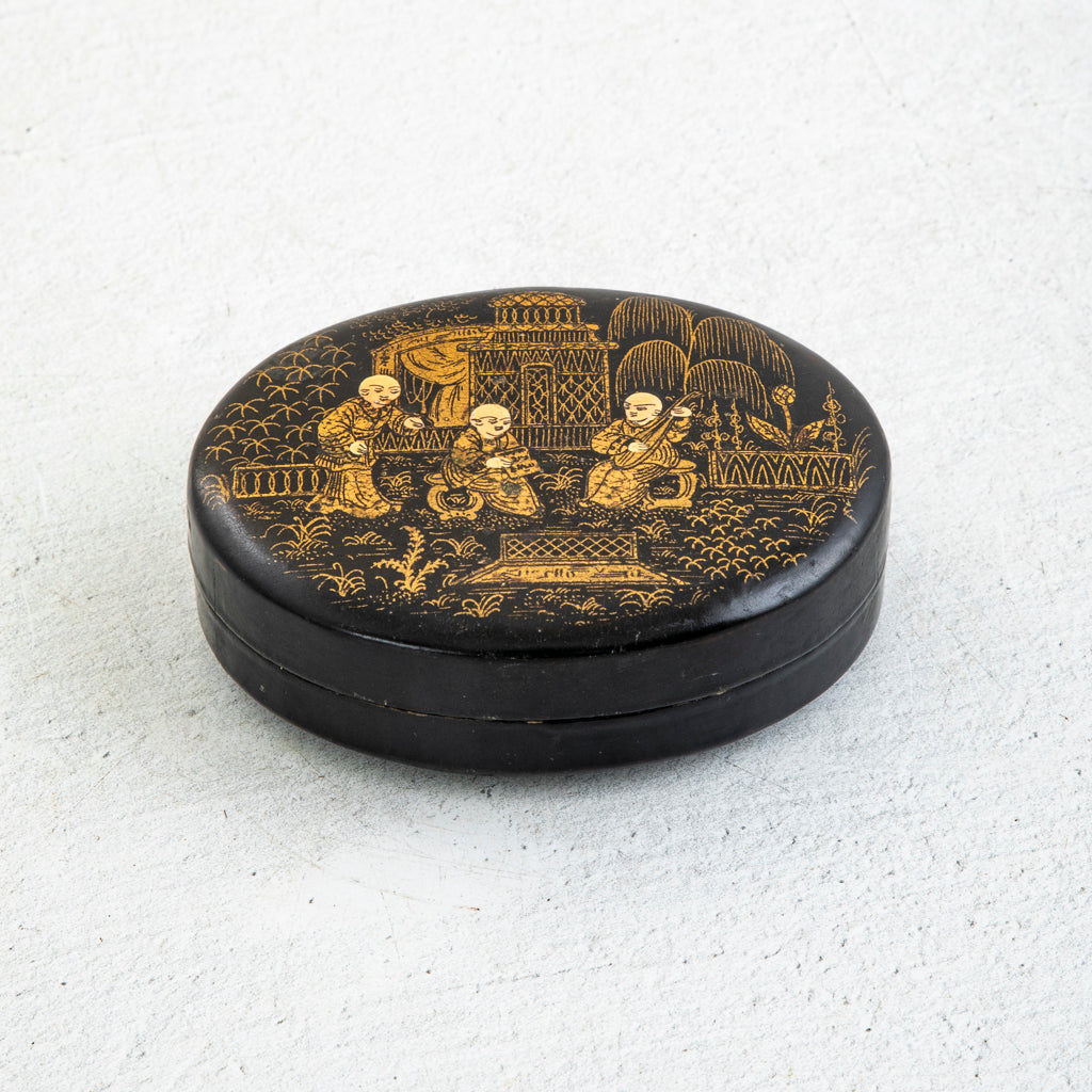 Napoleon III period oval papier mache box with chinoiserie. Advertisement Inside the lid is for a local surgeon, c. 1860. 1.25" H X 4.25" W X 3.5" D ...