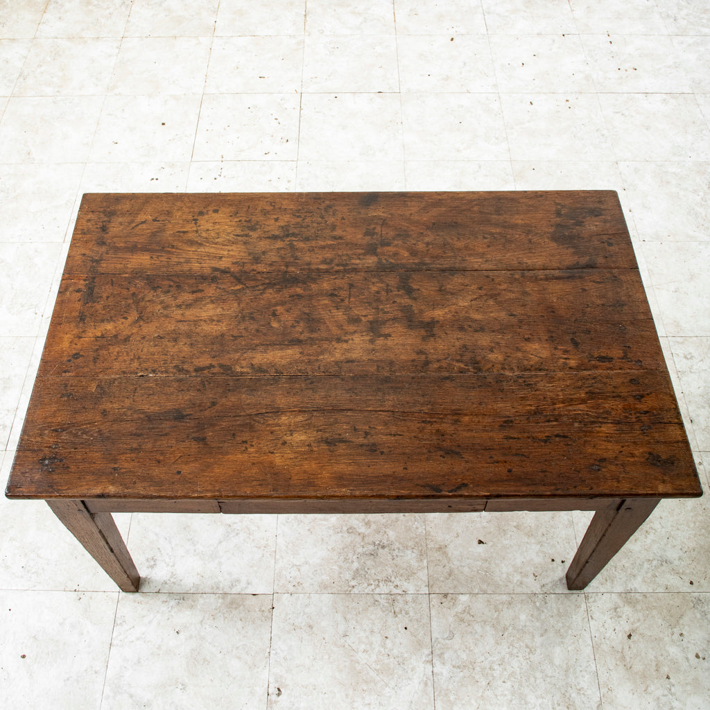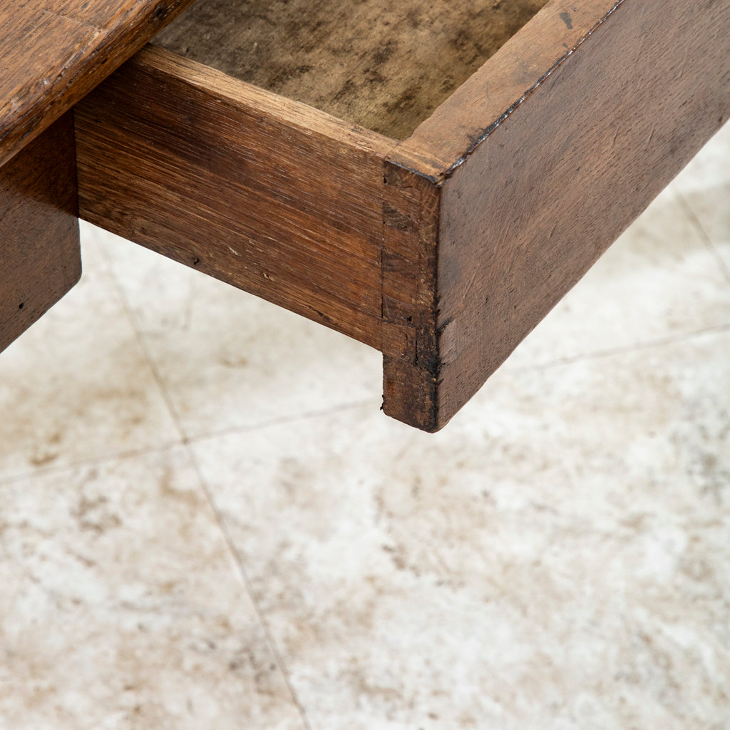 Nineteenth century rustic oak mountain table with single drawer, engraved with the artisan's initials RA. c. 1850. 19.5" H X 25.5" W X 17.5" D