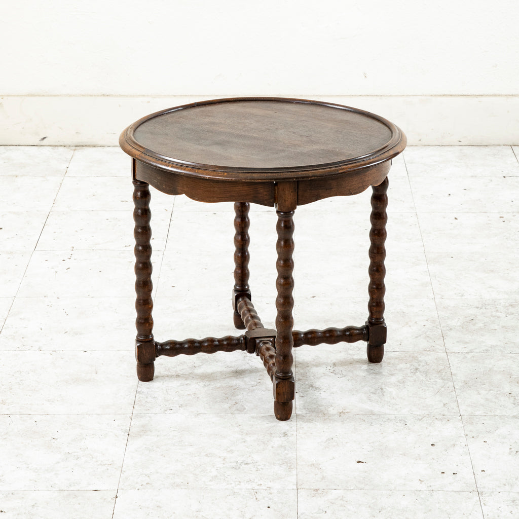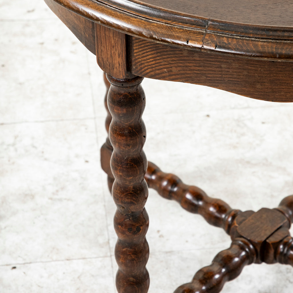 Round oak side table with turned legs and X stretcher, c. 1920. 19.5" H X 21.5" Diameter