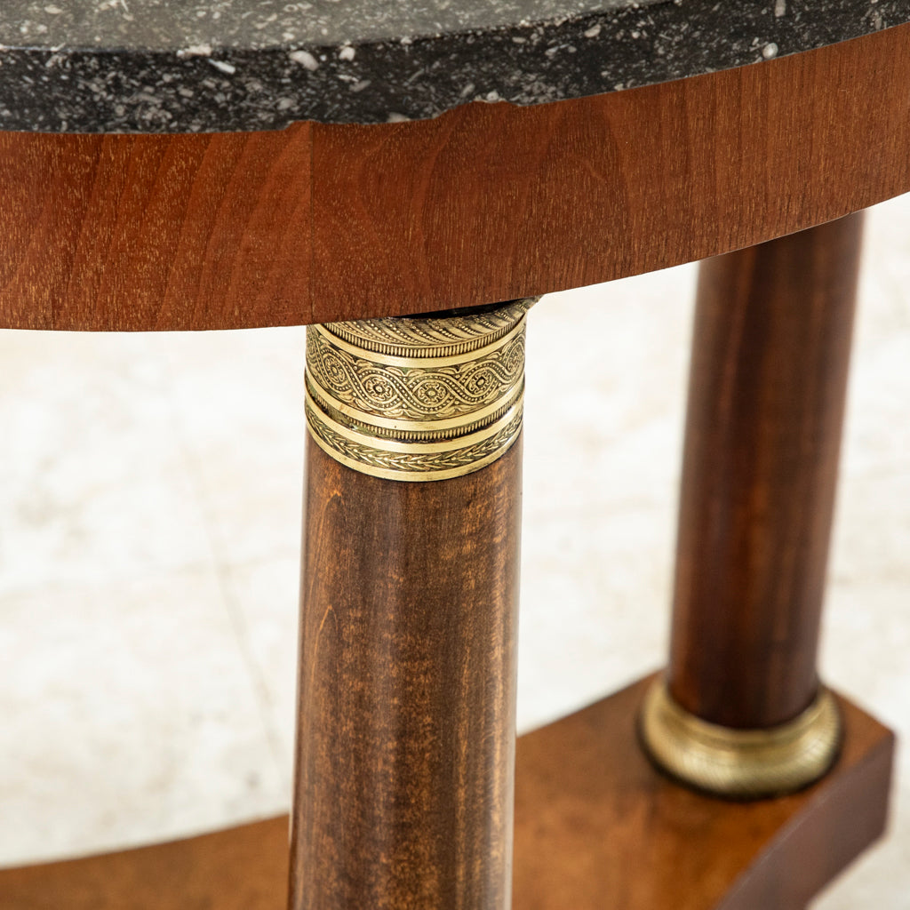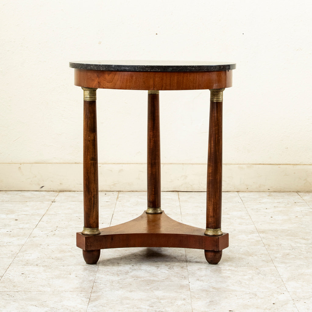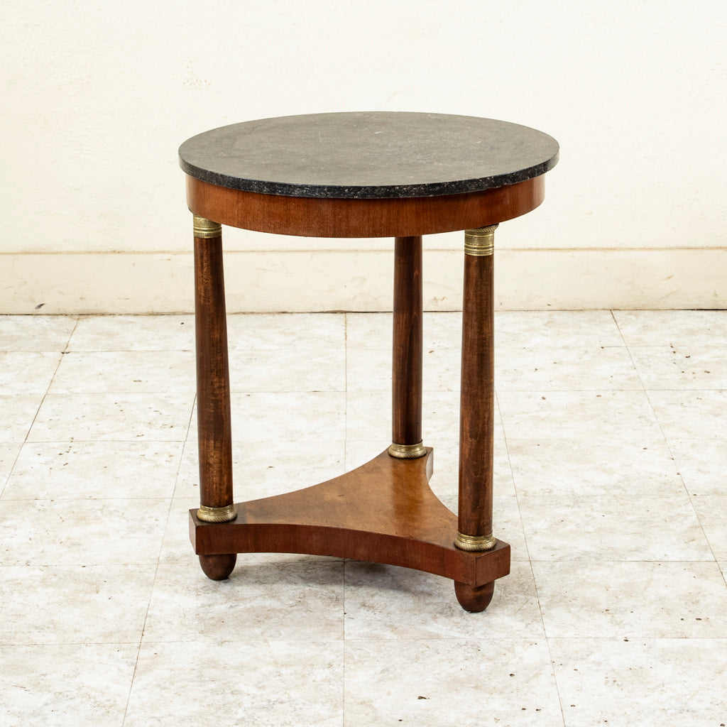 Early nineteenth century Empire period round mahogany side table with three columned tripod base, bronze detailing, and black marble top, c. 1810. 27.75" H X 23.5" Diameter