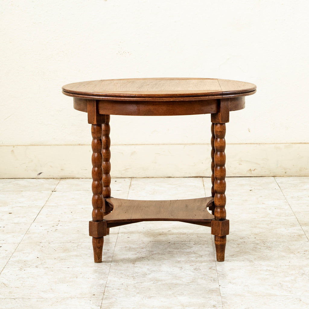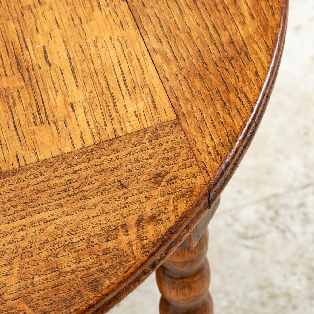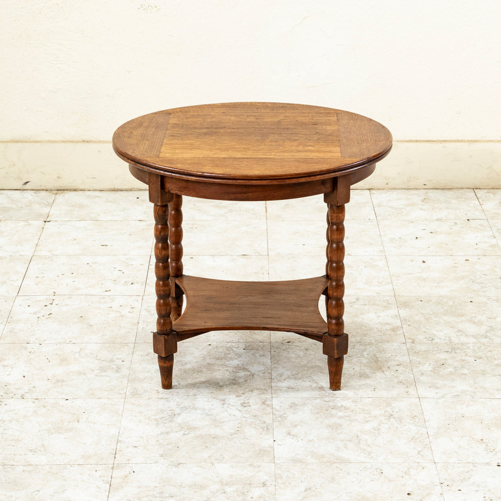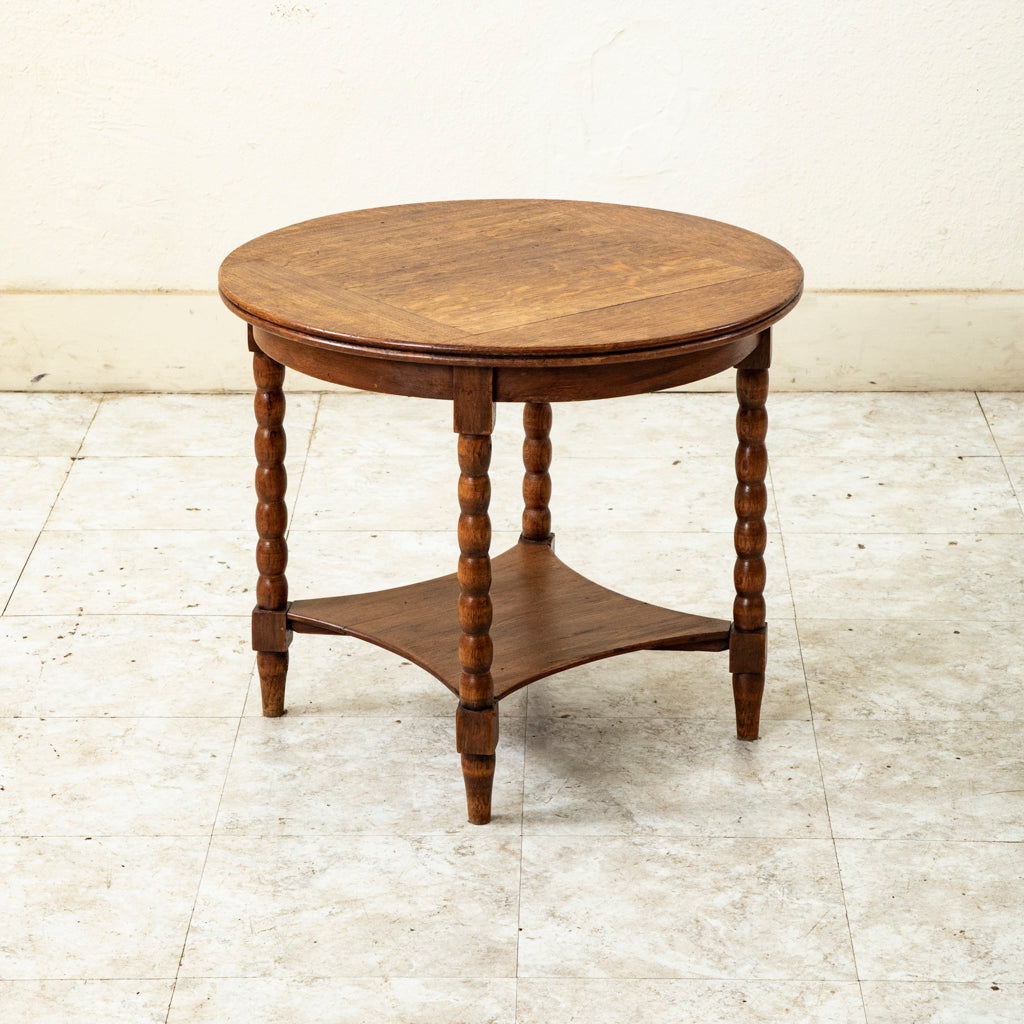 Round oak side table with turned legs and lower shelf, c. 1920. 20" H X 23.5" Diameter
