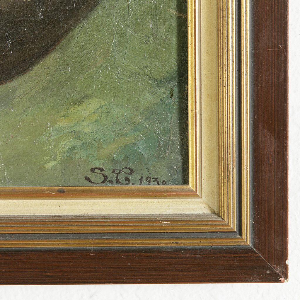 Early twentieth century framed oil painting. Still life with green confit pot. Signed C. Lampe and dated 1926. 10.5" Square framed