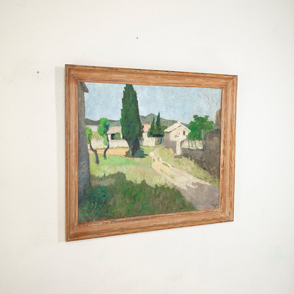 Twentieth century unframed oil painting on artboard. Landscape scene with French house and terrace. 10.5" H X 13.5" W