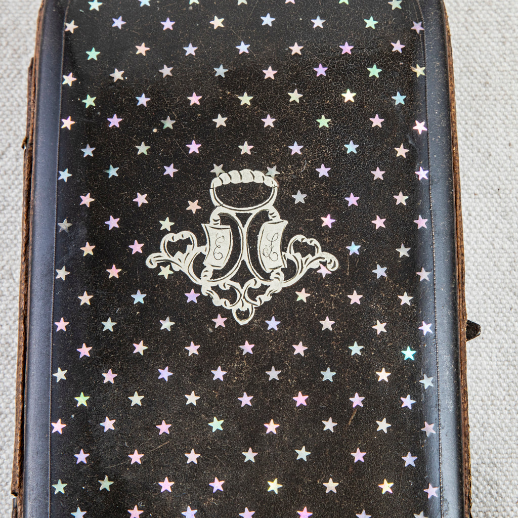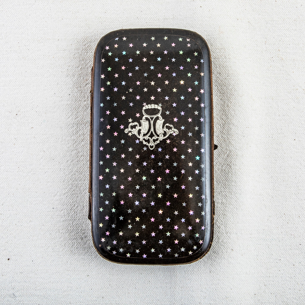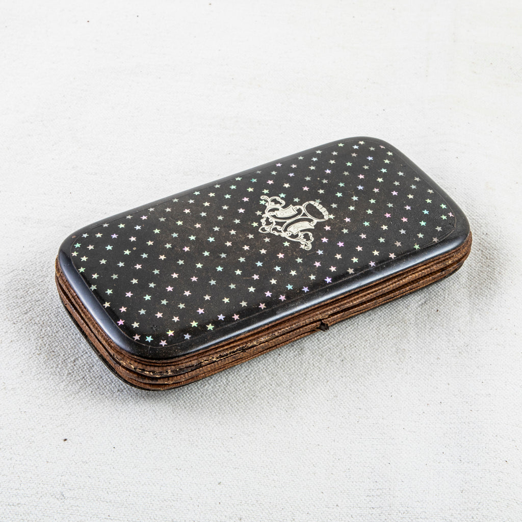 Nineteenth century Napoleon III period black lacquer cigarette case with mother of pearl star pattern and silver inlay, c. 1860. 5.5" L X 3" W X 0.5" H ...