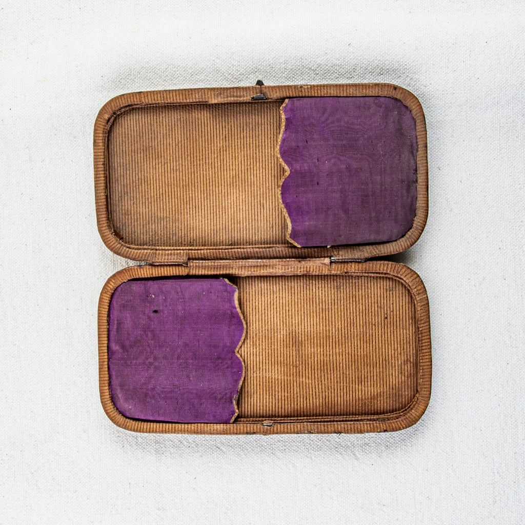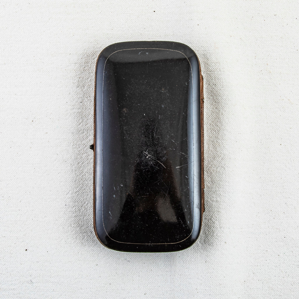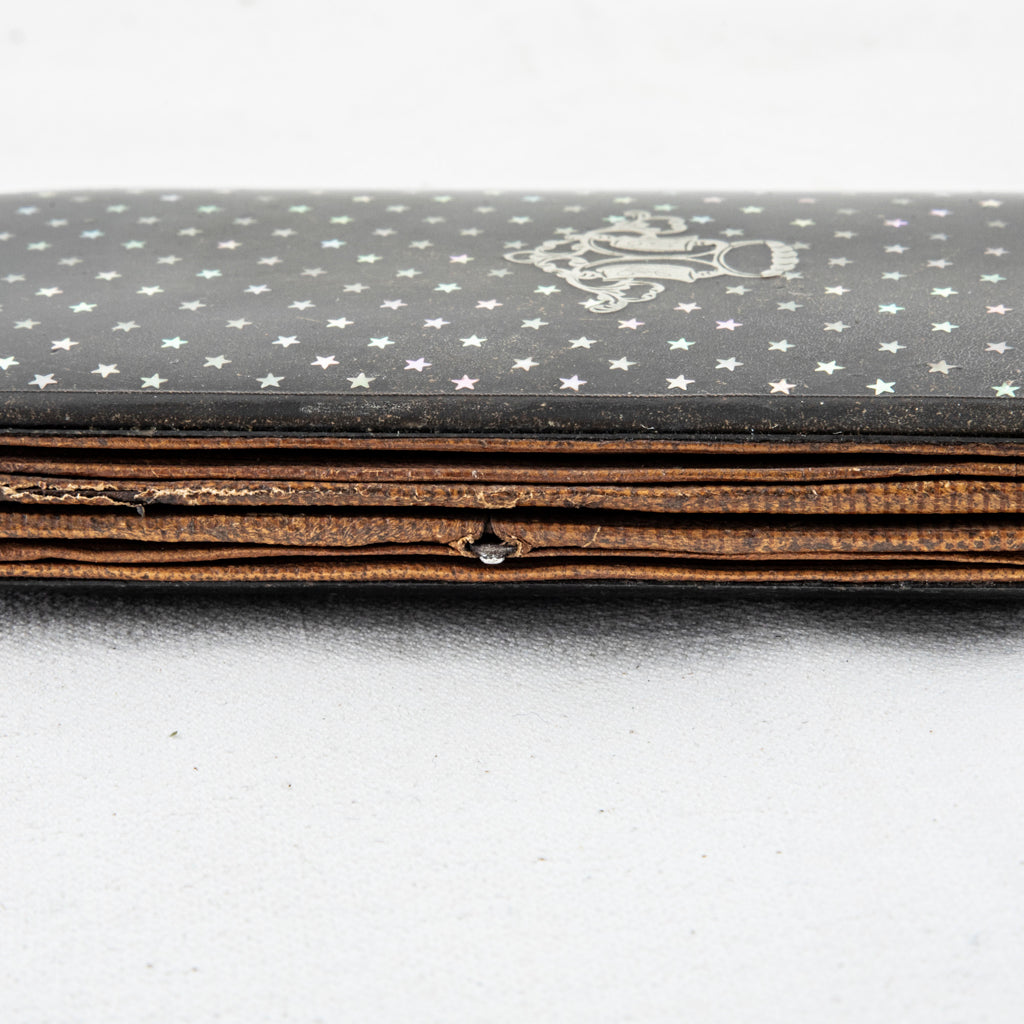 Nineteenth century Napoleon III period black lacquer cigarette case with mother of pearl star pattern and silver inlay, c. 1860. 5.5" L X 3" W X 0.5" H ...