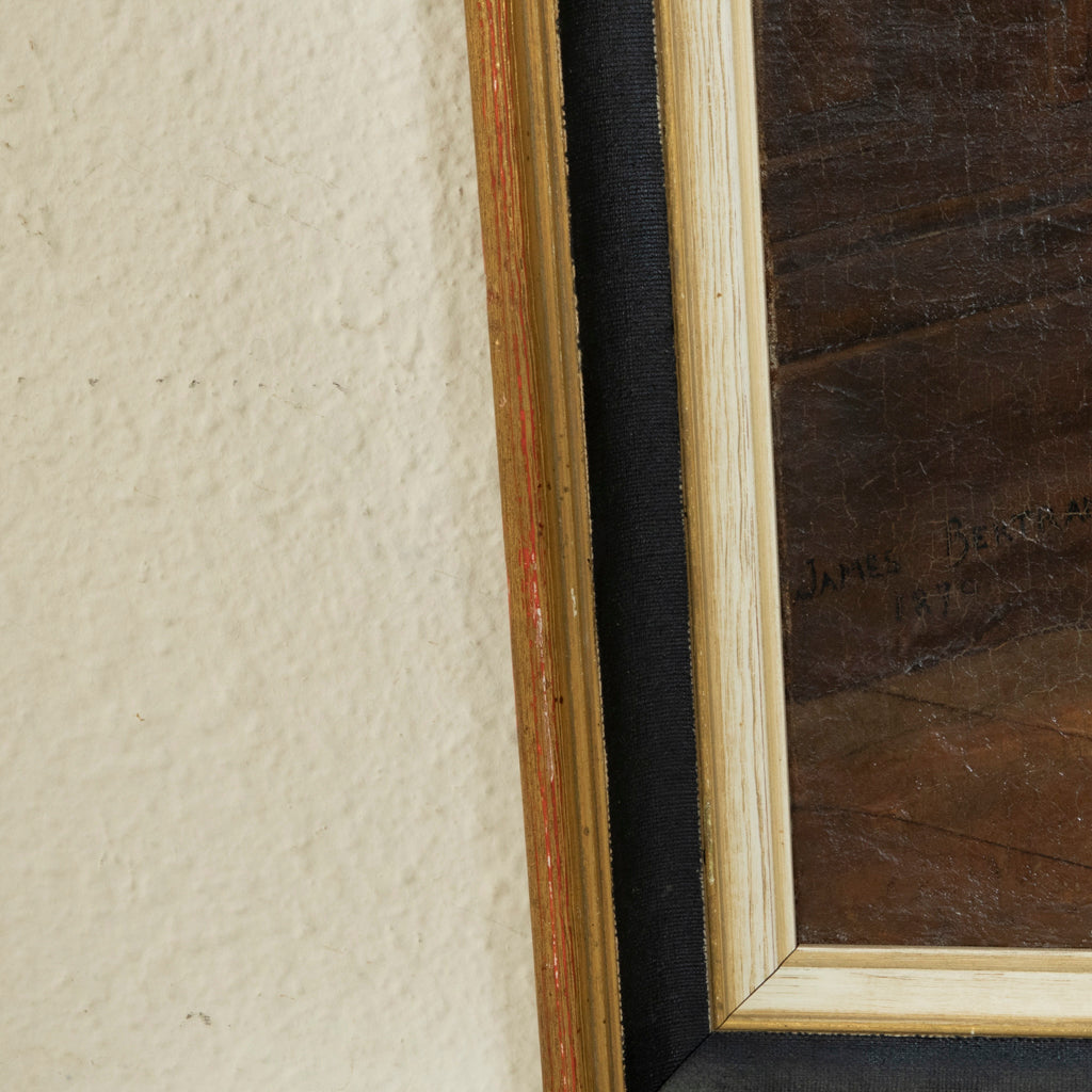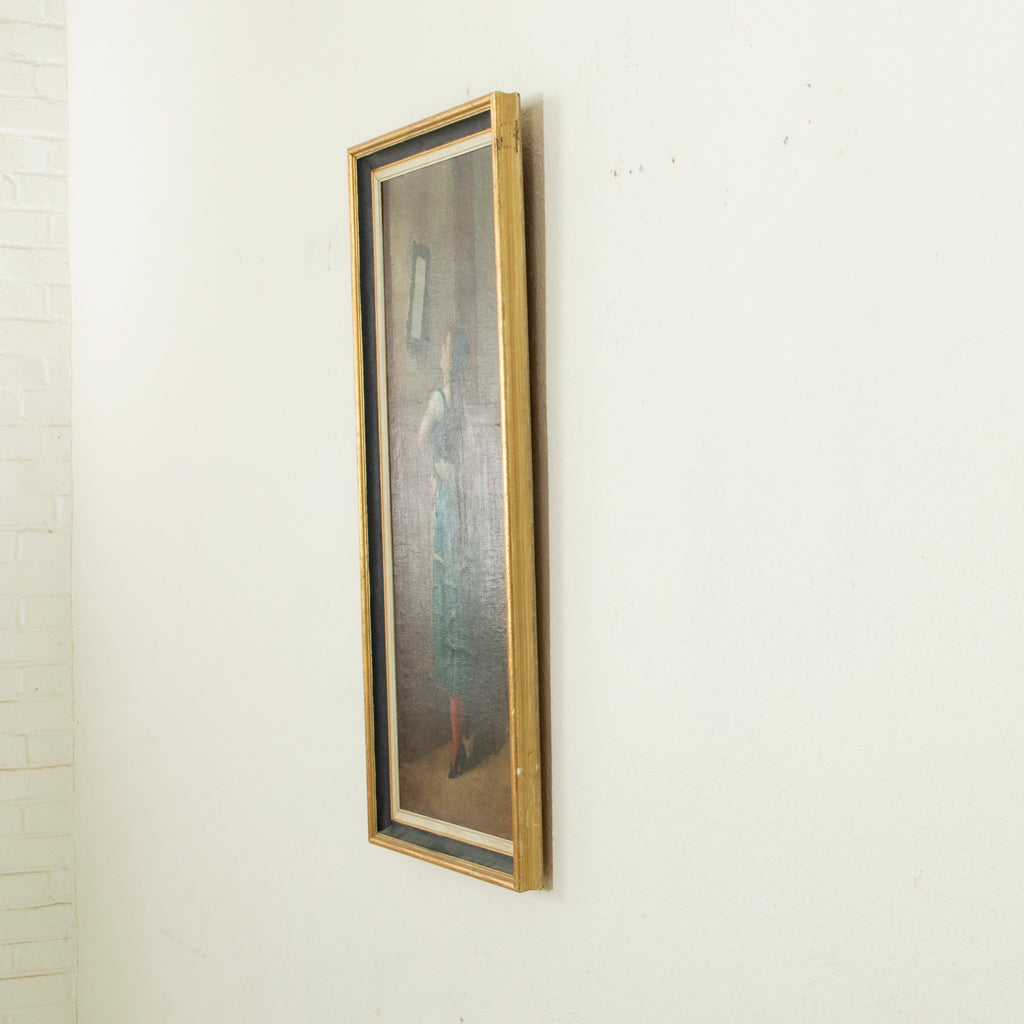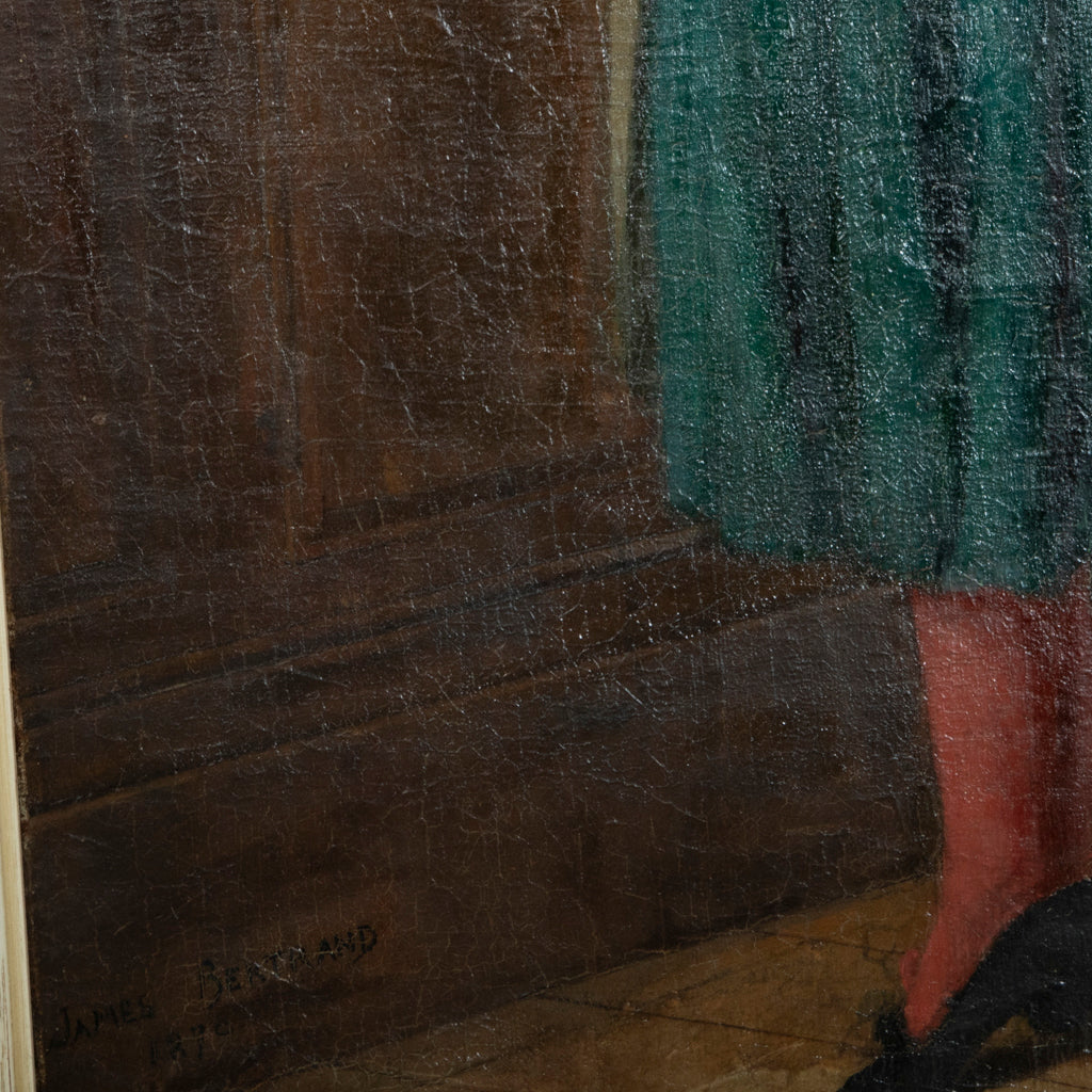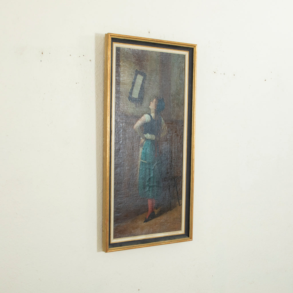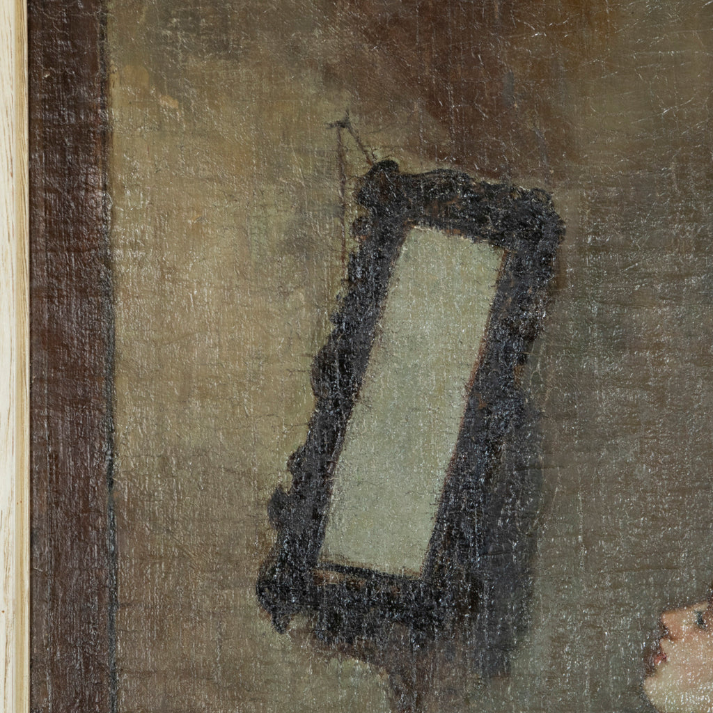 Painting, Nineteenth century oil on canvas, unframed. Signed James Bertrand 1870. Genre painting of a little girl standing on her tiptoes to look in the mirror. Evokes her hope to...