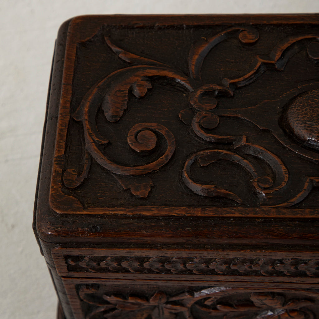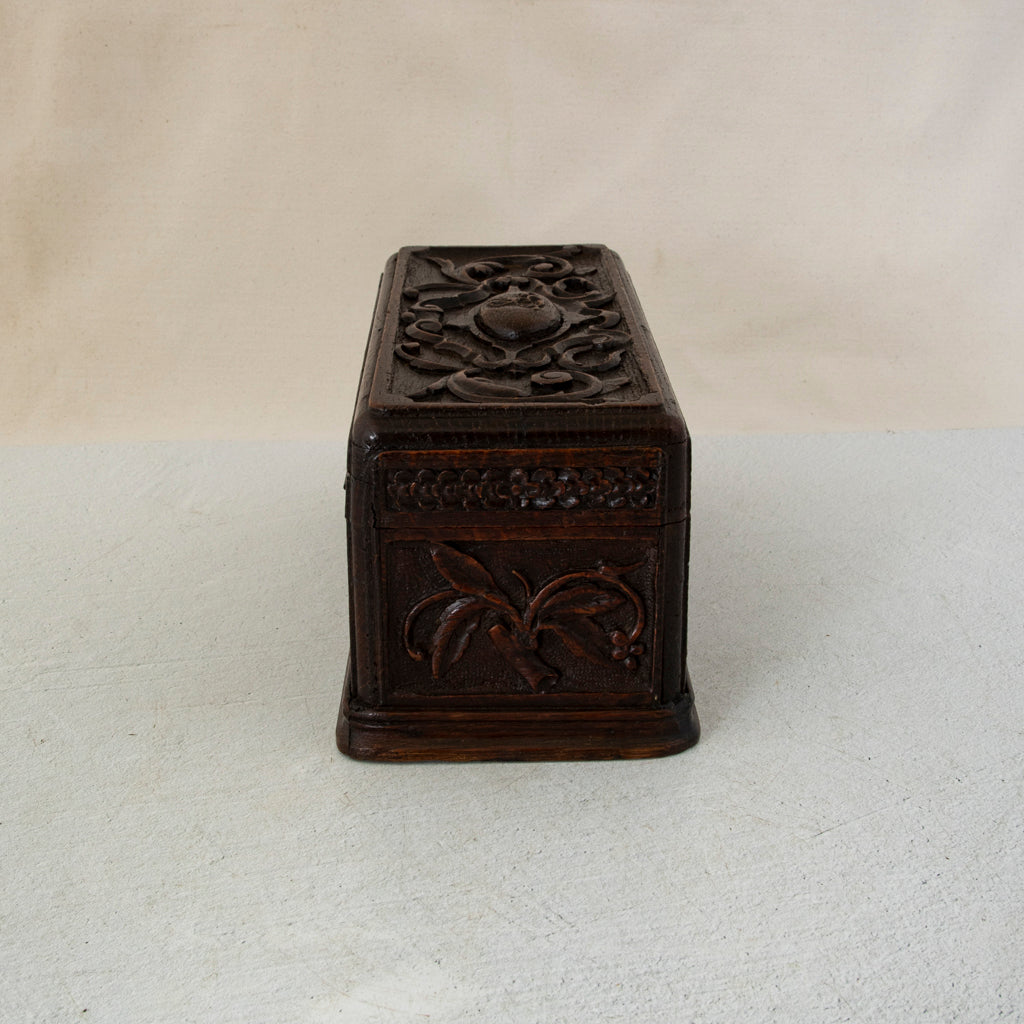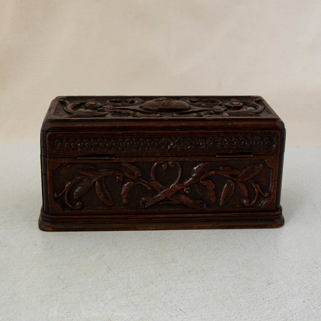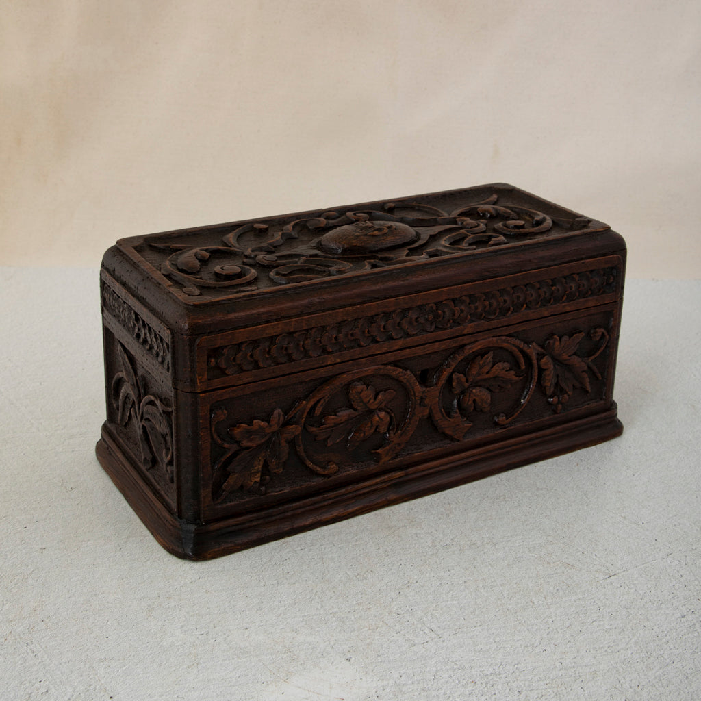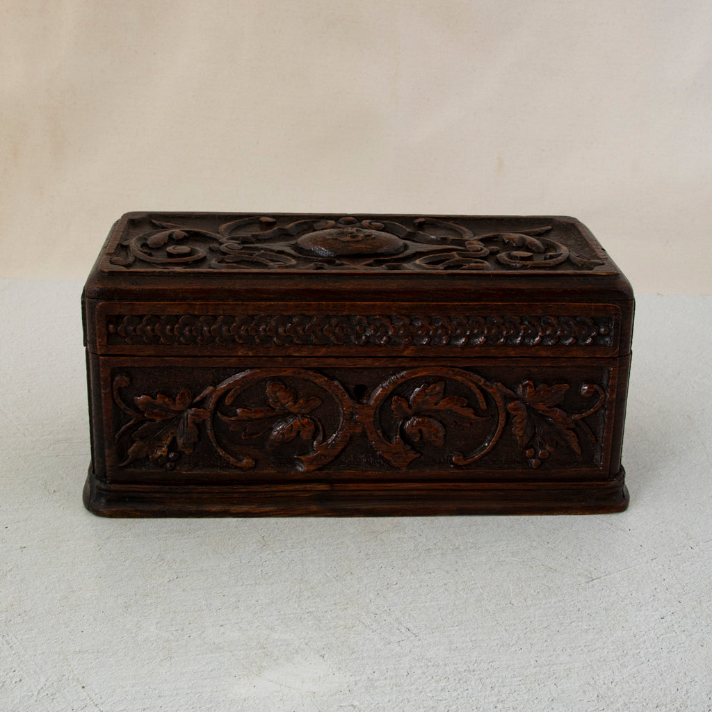 Late nineteenth century hand carved oak box with grape vines, c. 1890. 5" H X 10.5" W X 5" D