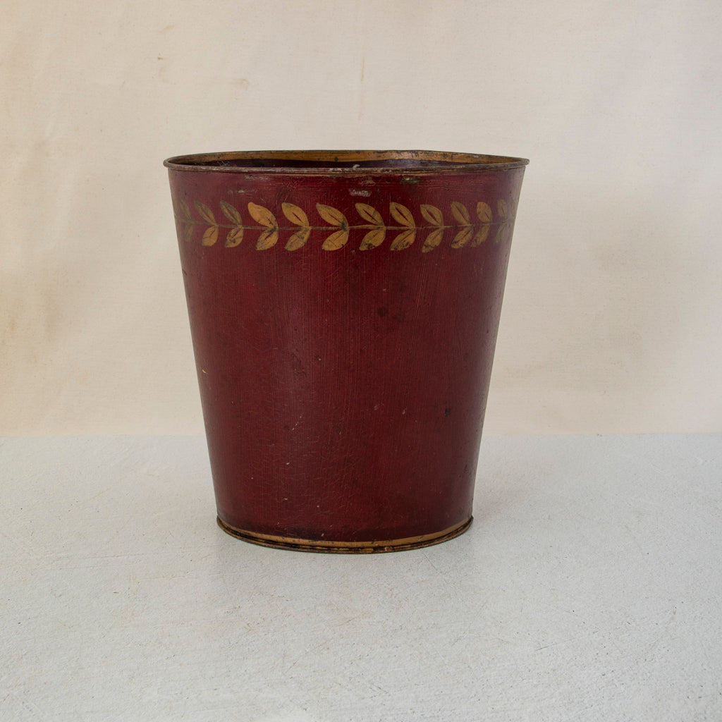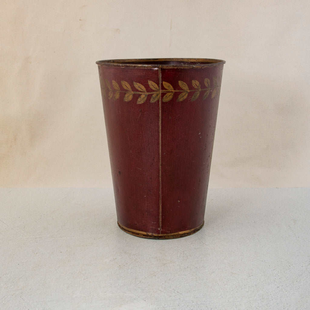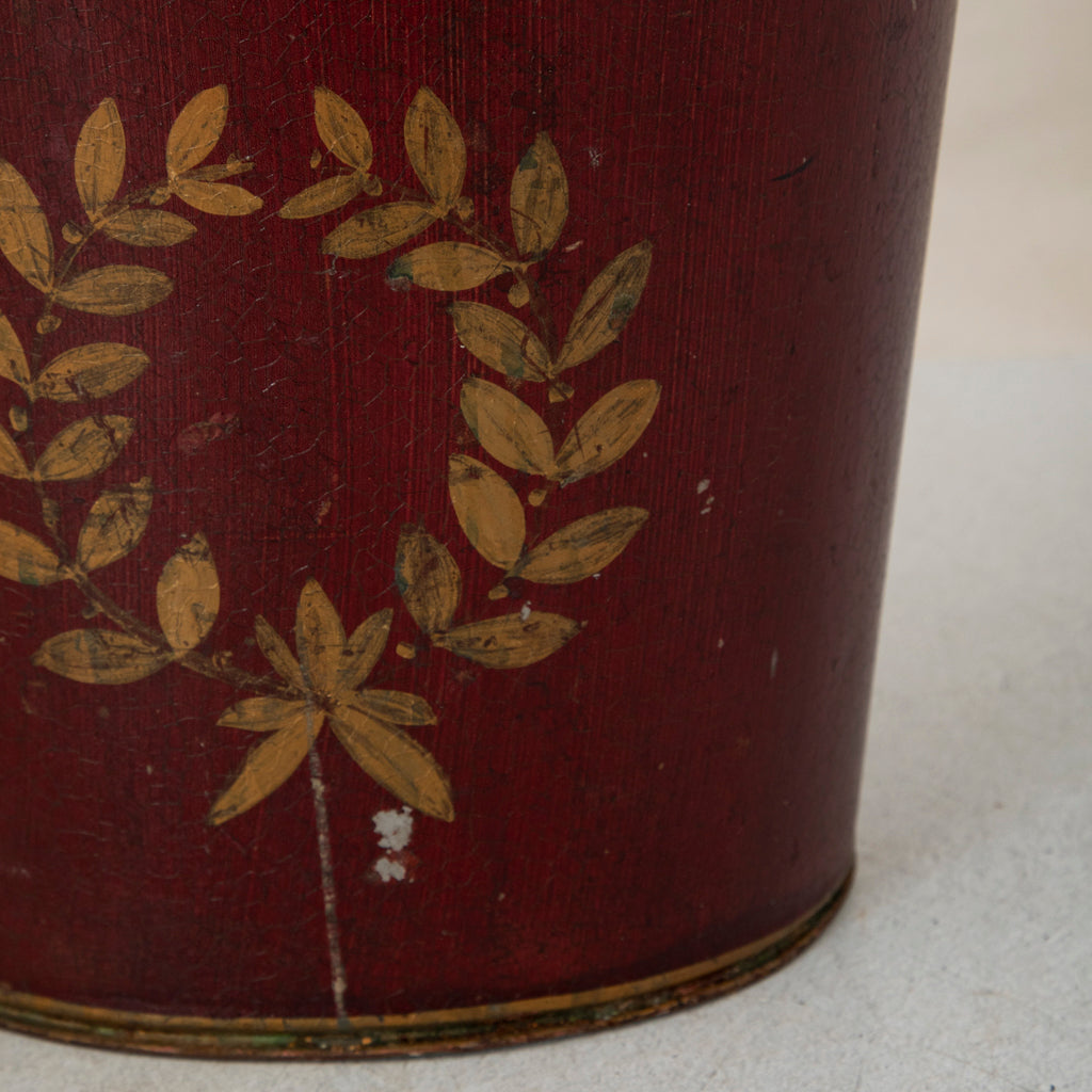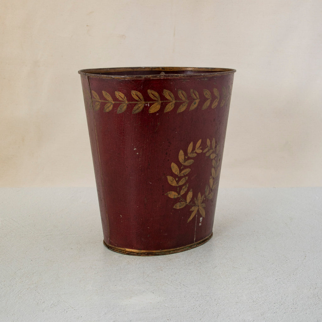 Napoleon III period red tole wastebasket or cachepot with hand painted gold laurel crown, c. 1860. 10" H X 9" W X 7.5" D