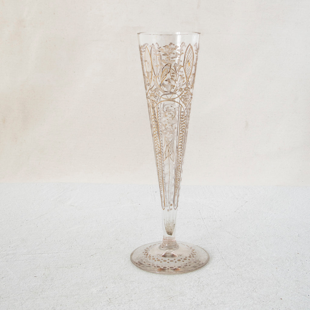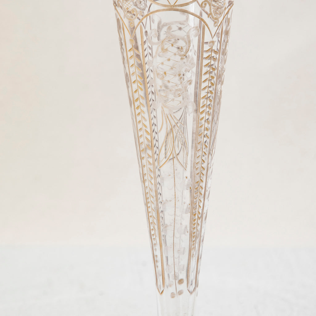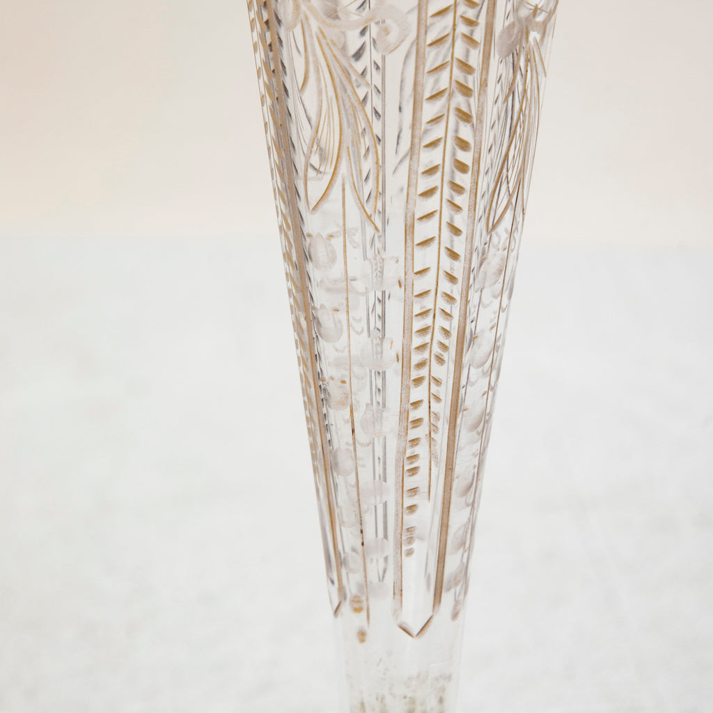 Etched crystal vase with hand painted gold detailing, c. 1900. 9.5" H X 2.5" Diameter
