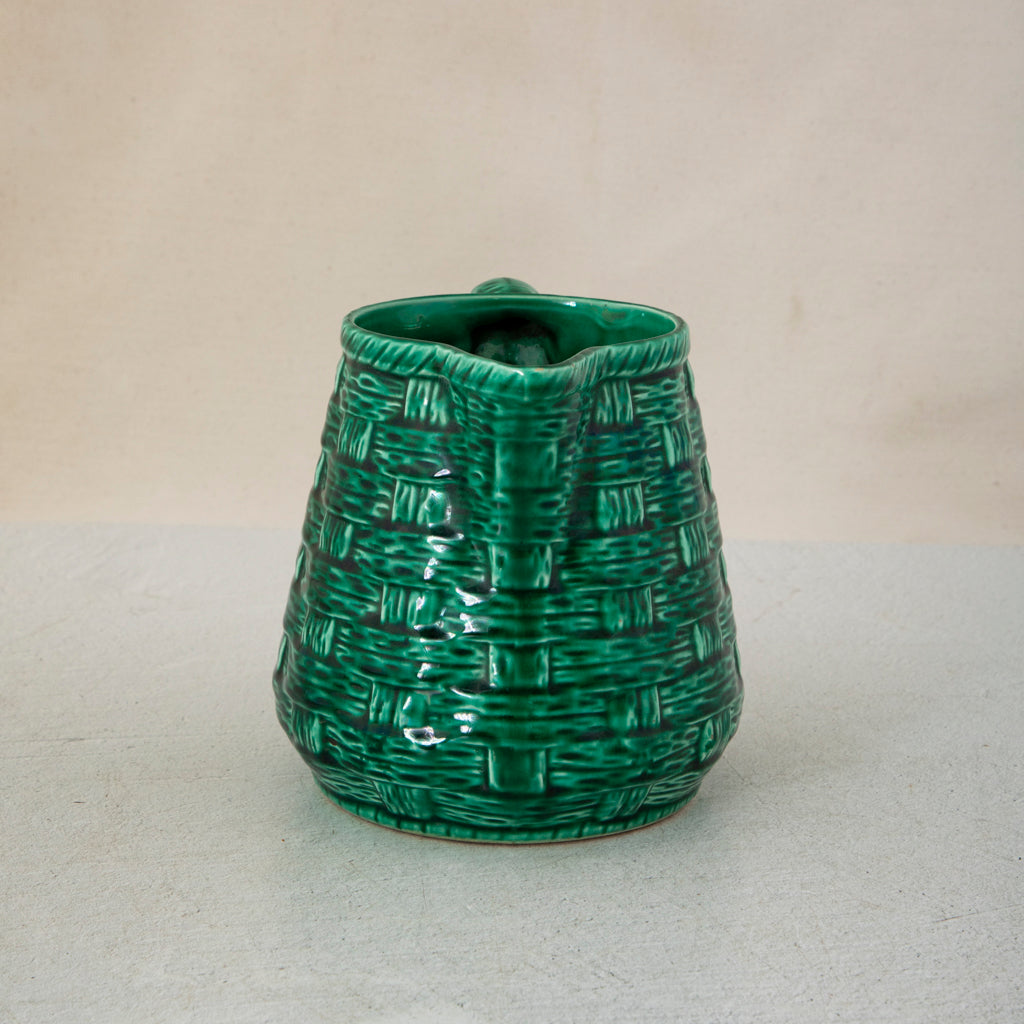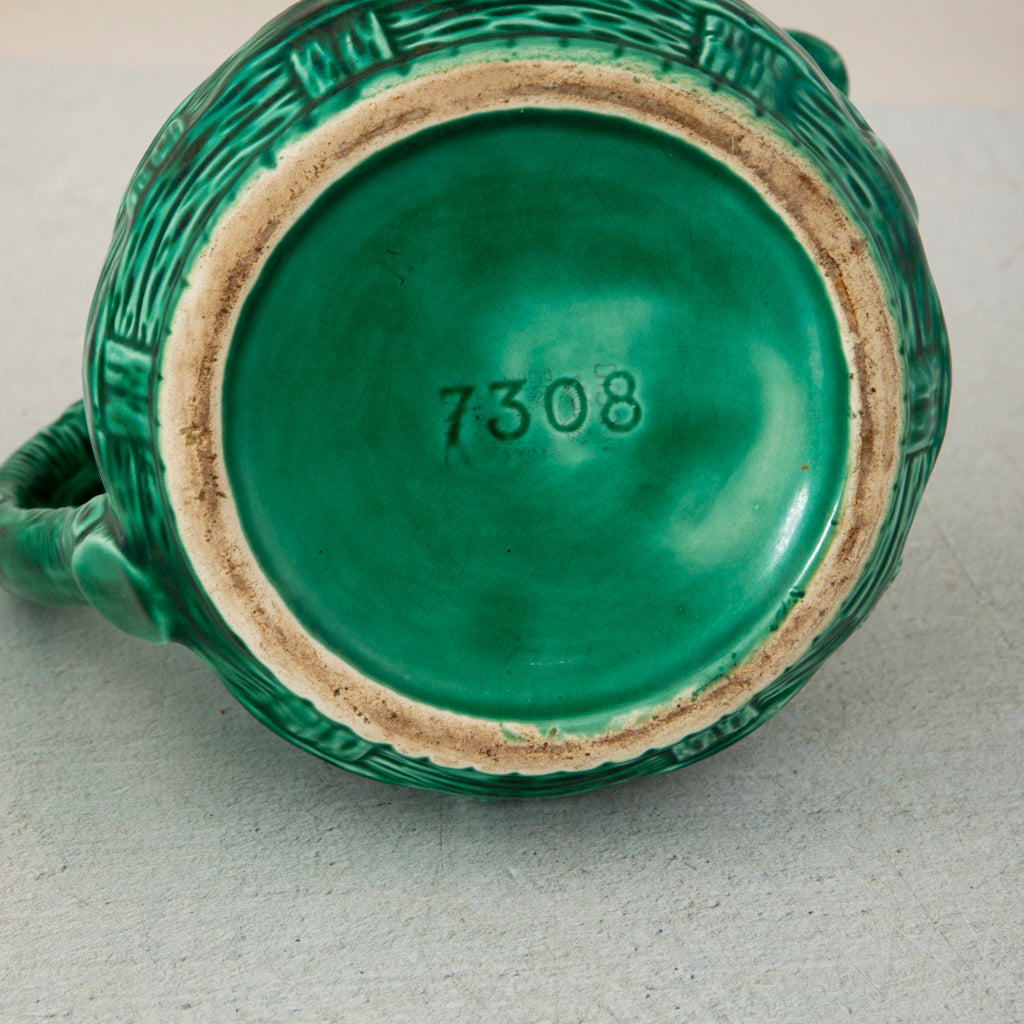 Green Majolica pitcher with basket weave motif. 5.5" H X 5.25" Diameter 7" L with handle and spout