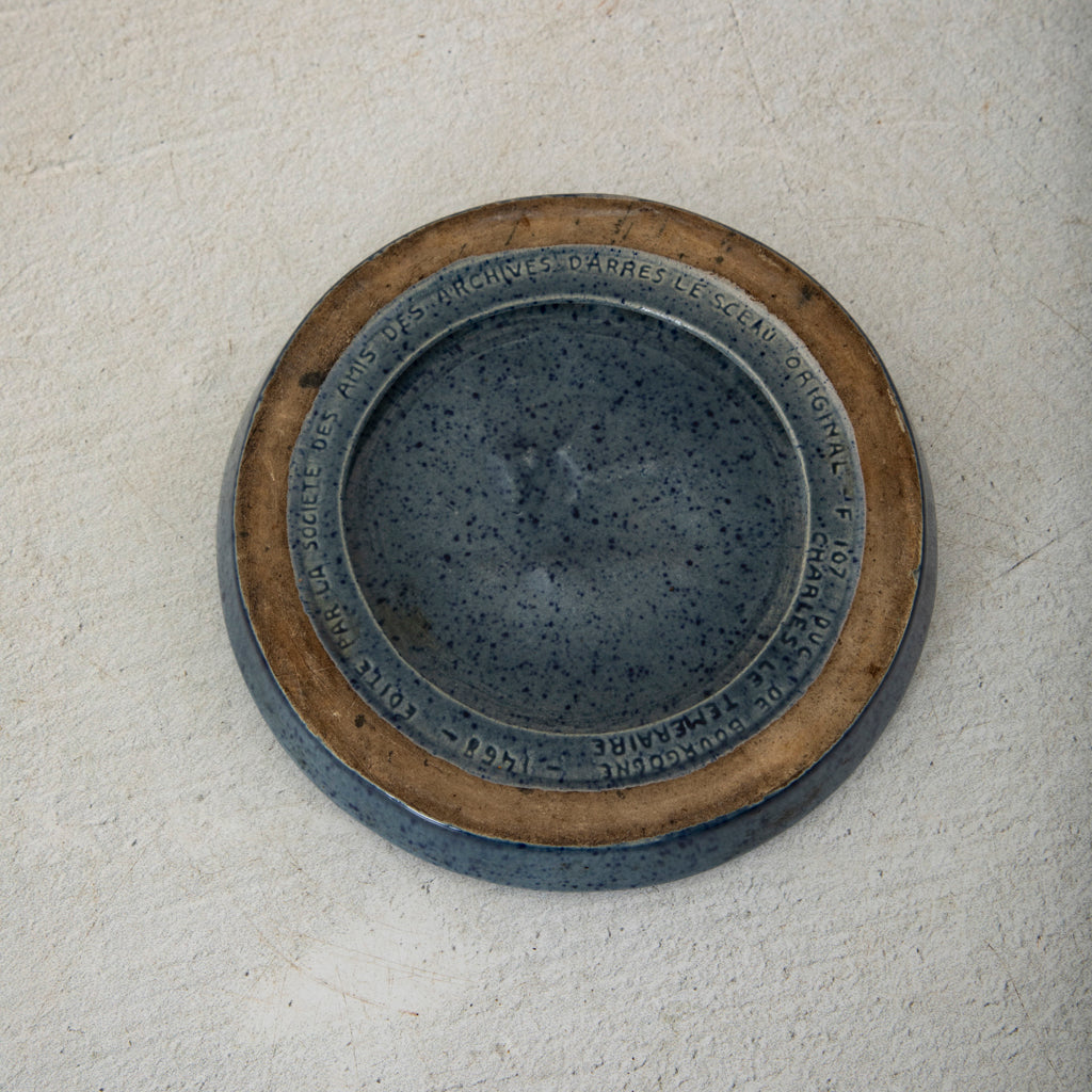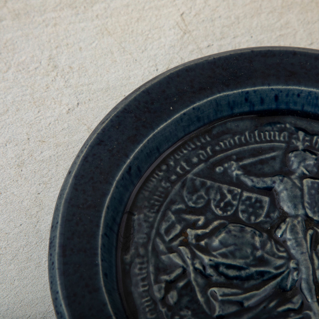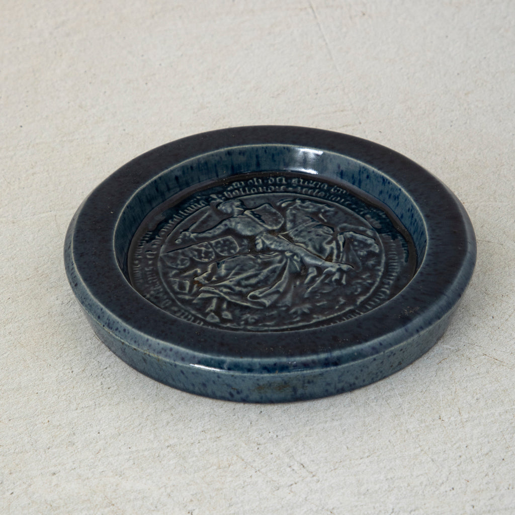 Mid twentieth century blue ceramic ashtray with seal of medieval knight. 1" H X 6" Diameter