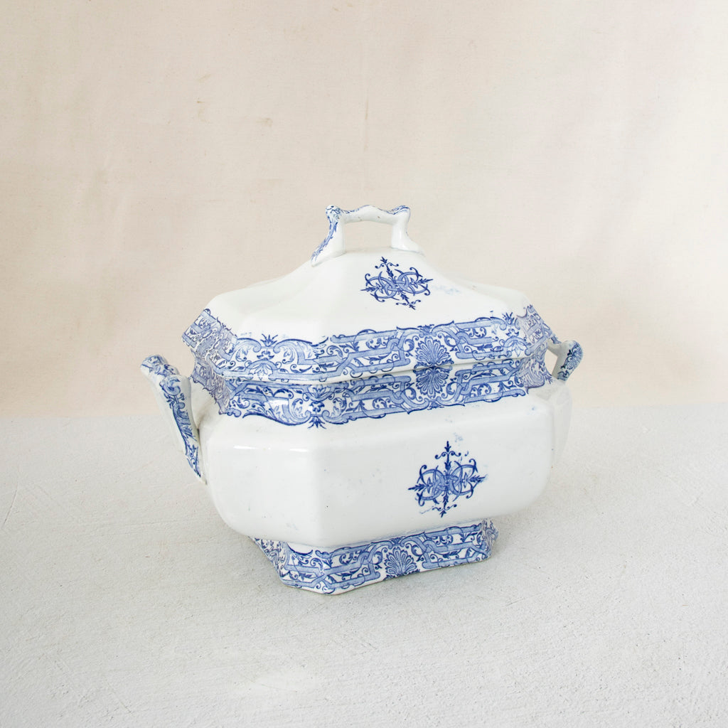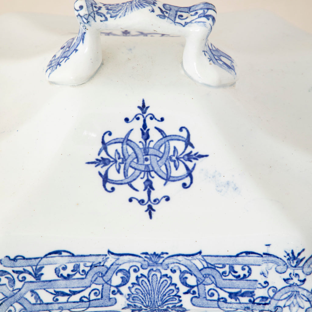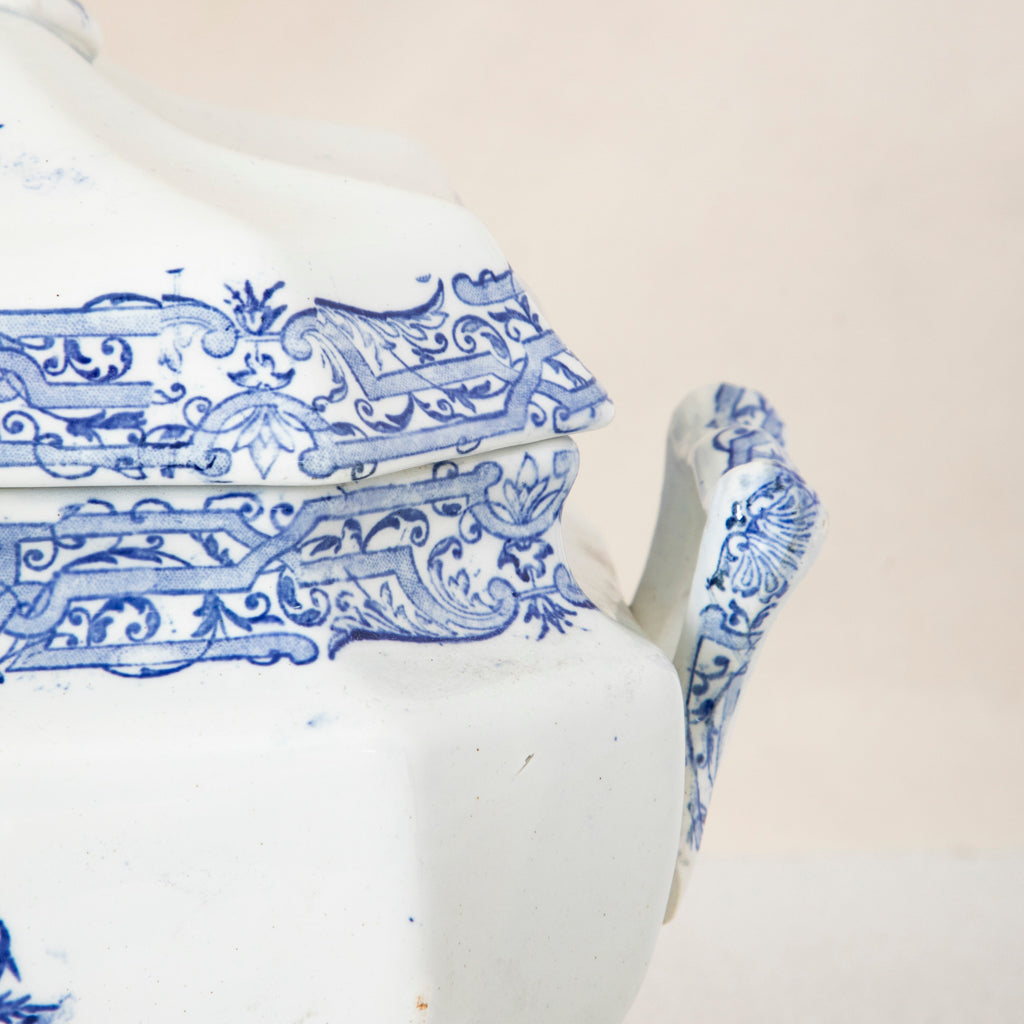 Late nineteenth century blue and white porcelain soup tureen with lid. 12" L X 7.5" W X 9" W