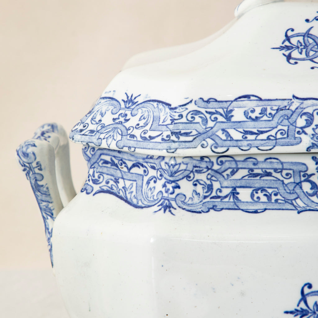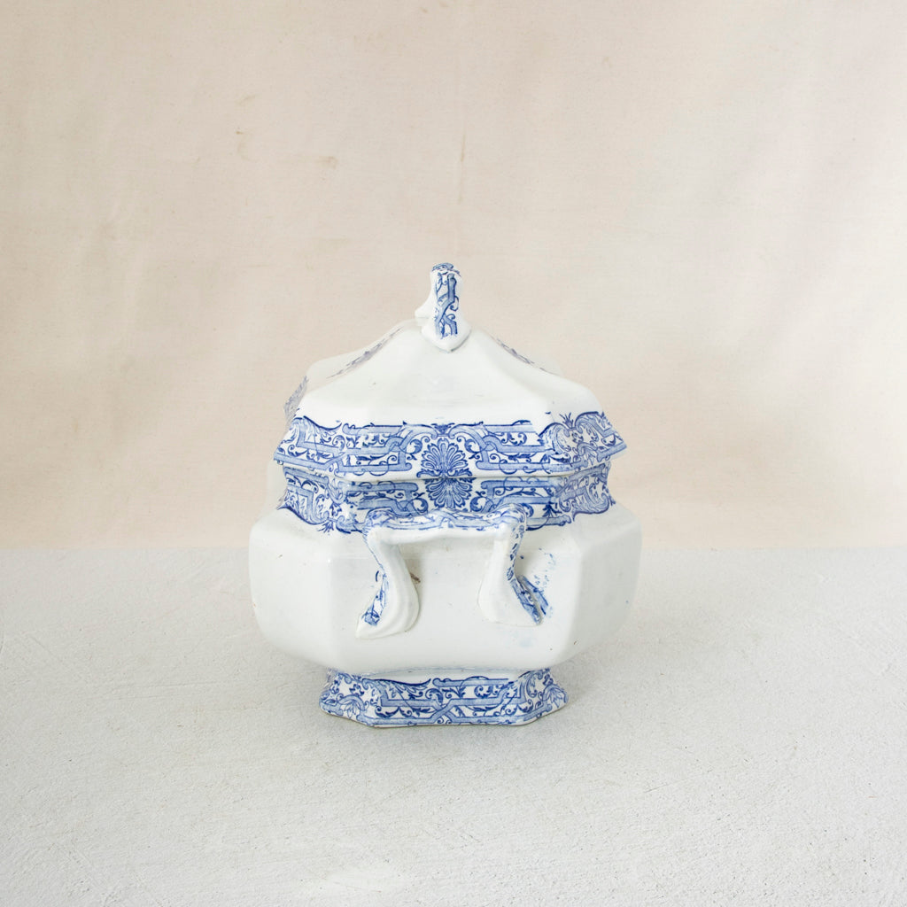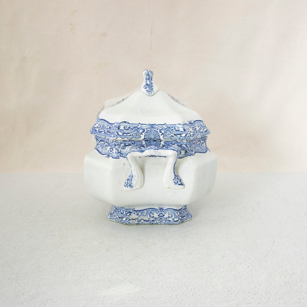 Late nineteenth century blue and white porcelain soup tureen with lid. 12" L X 7.5" W X 9" W