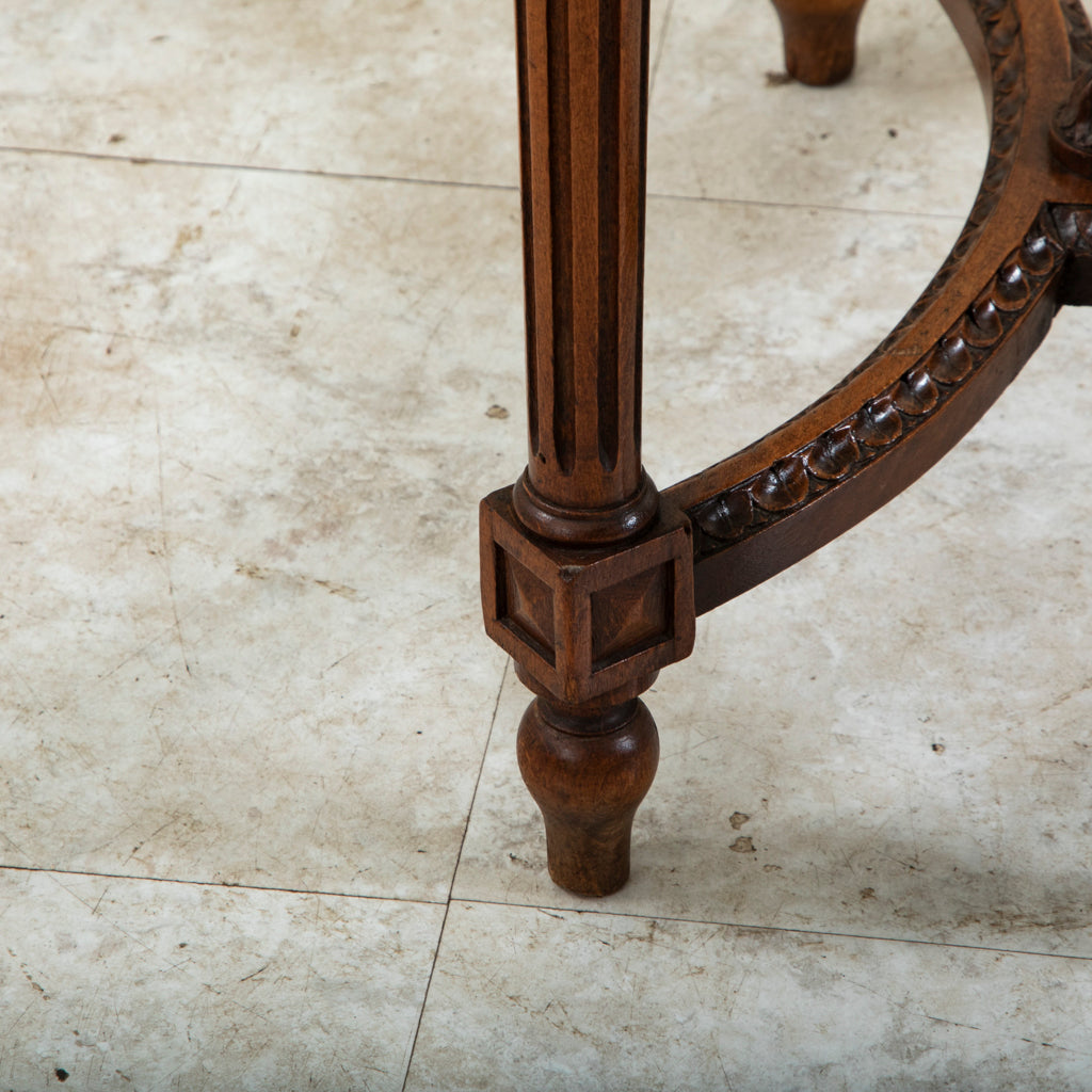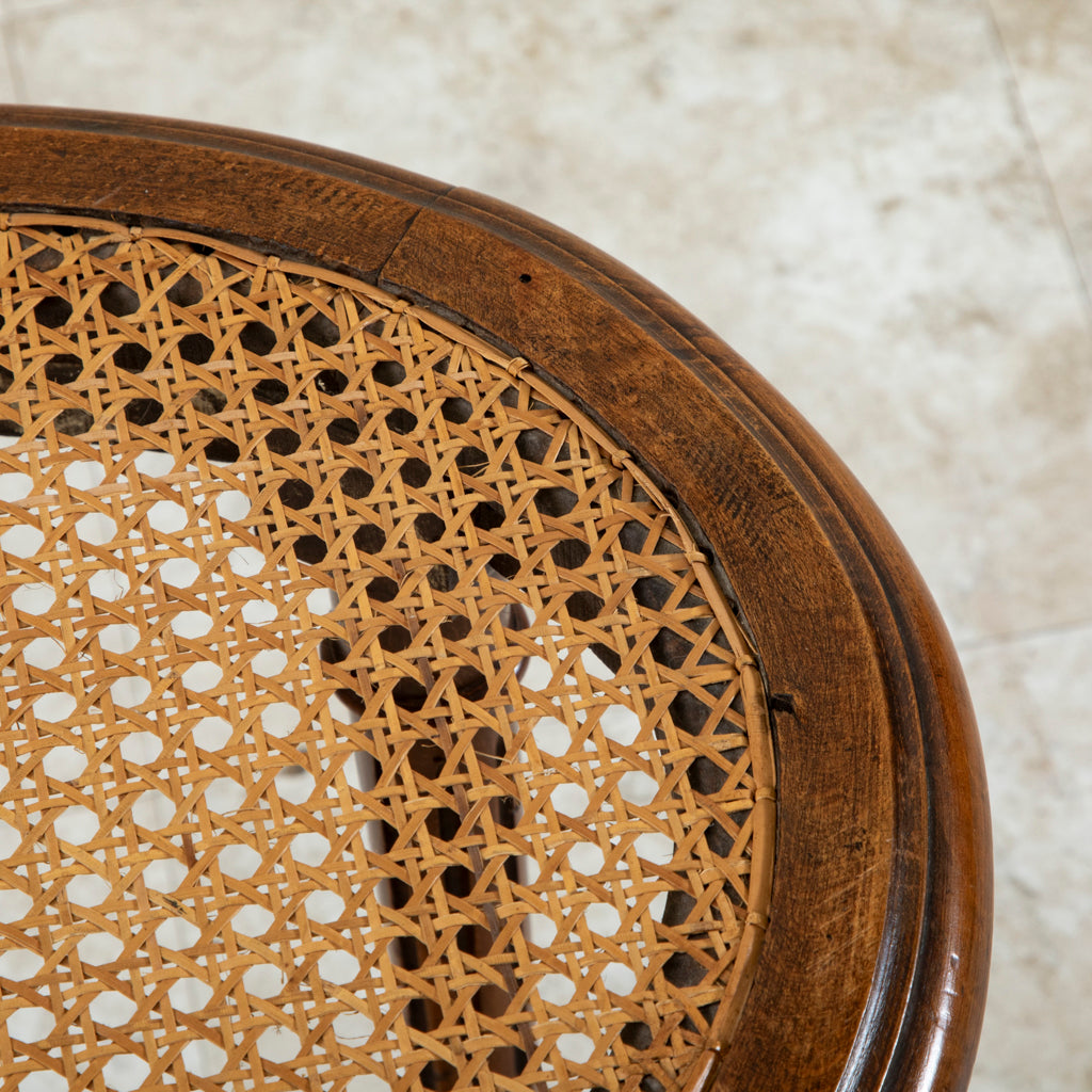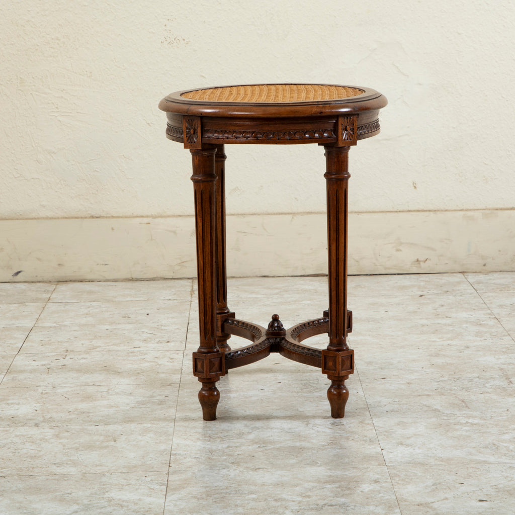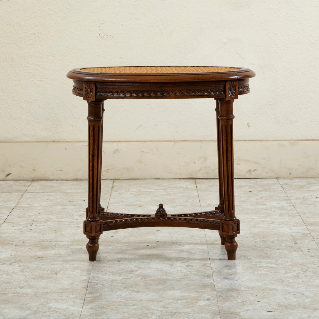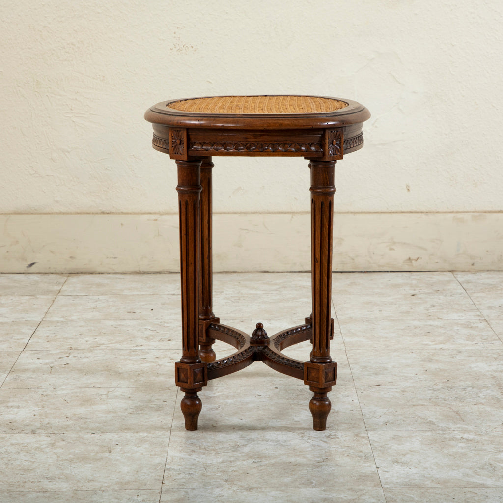 Early twentieth century Louis XVI style carved walnut vanity stool with caned seat. c. 1920. 19.5" H X 19.75" W X 14.5" D