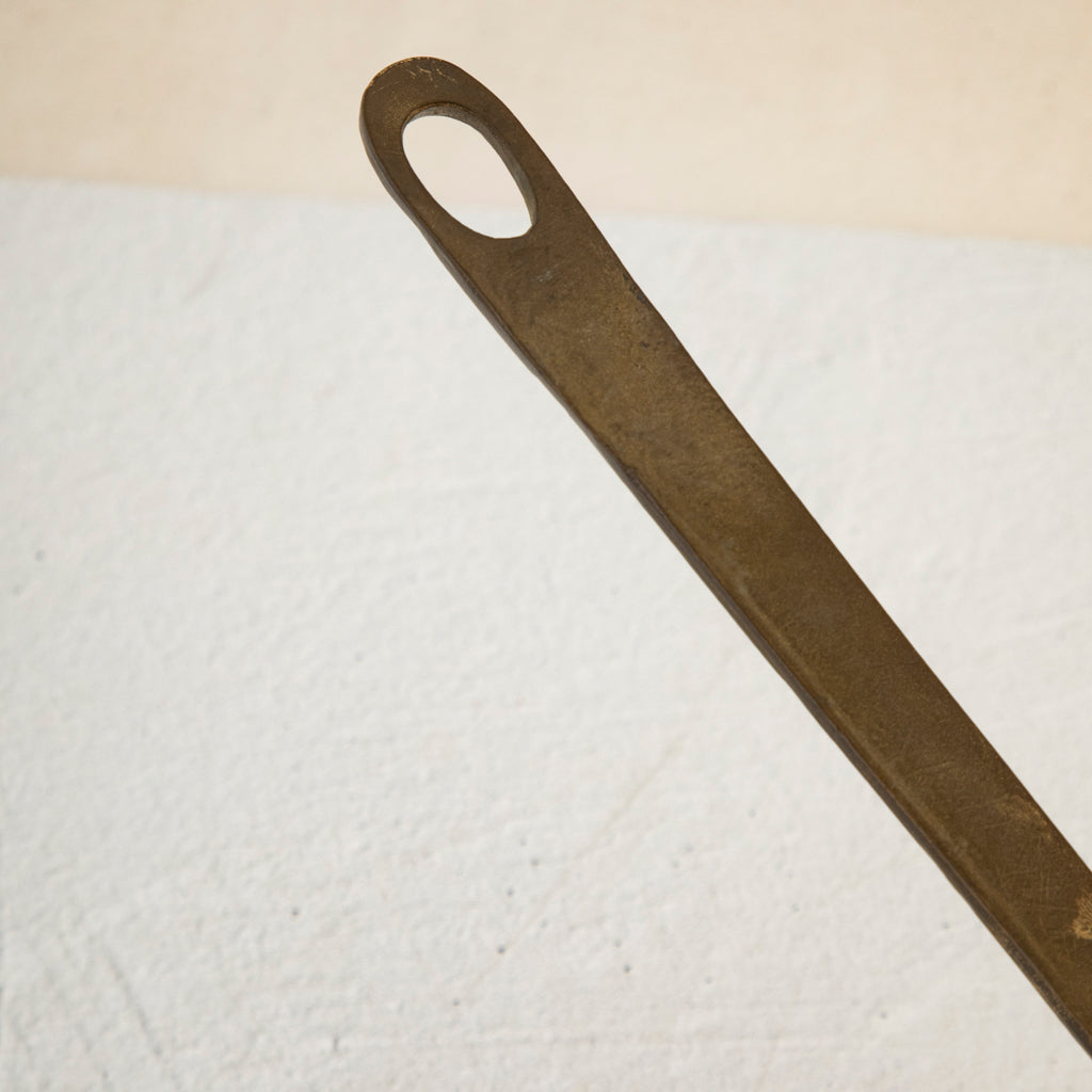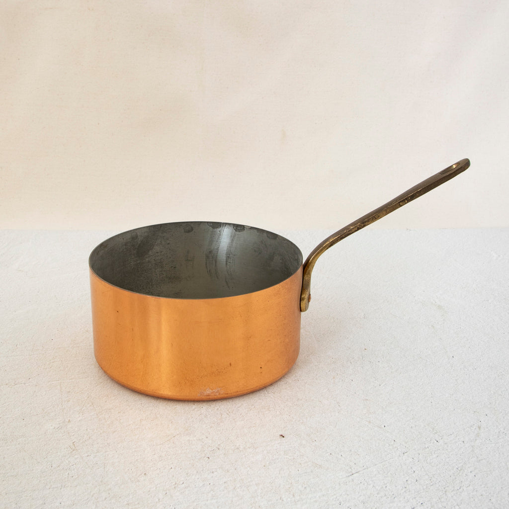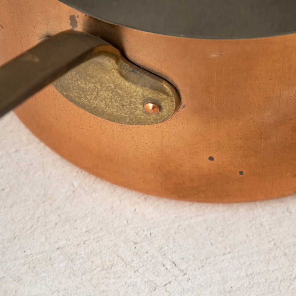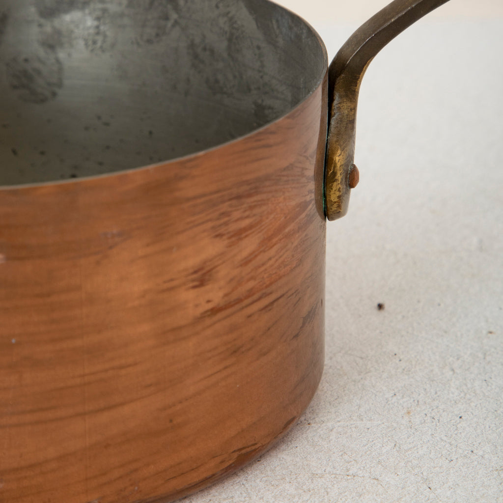 Set of five copper pots with copper riveted bronze handles. 5" to 8" Diameter