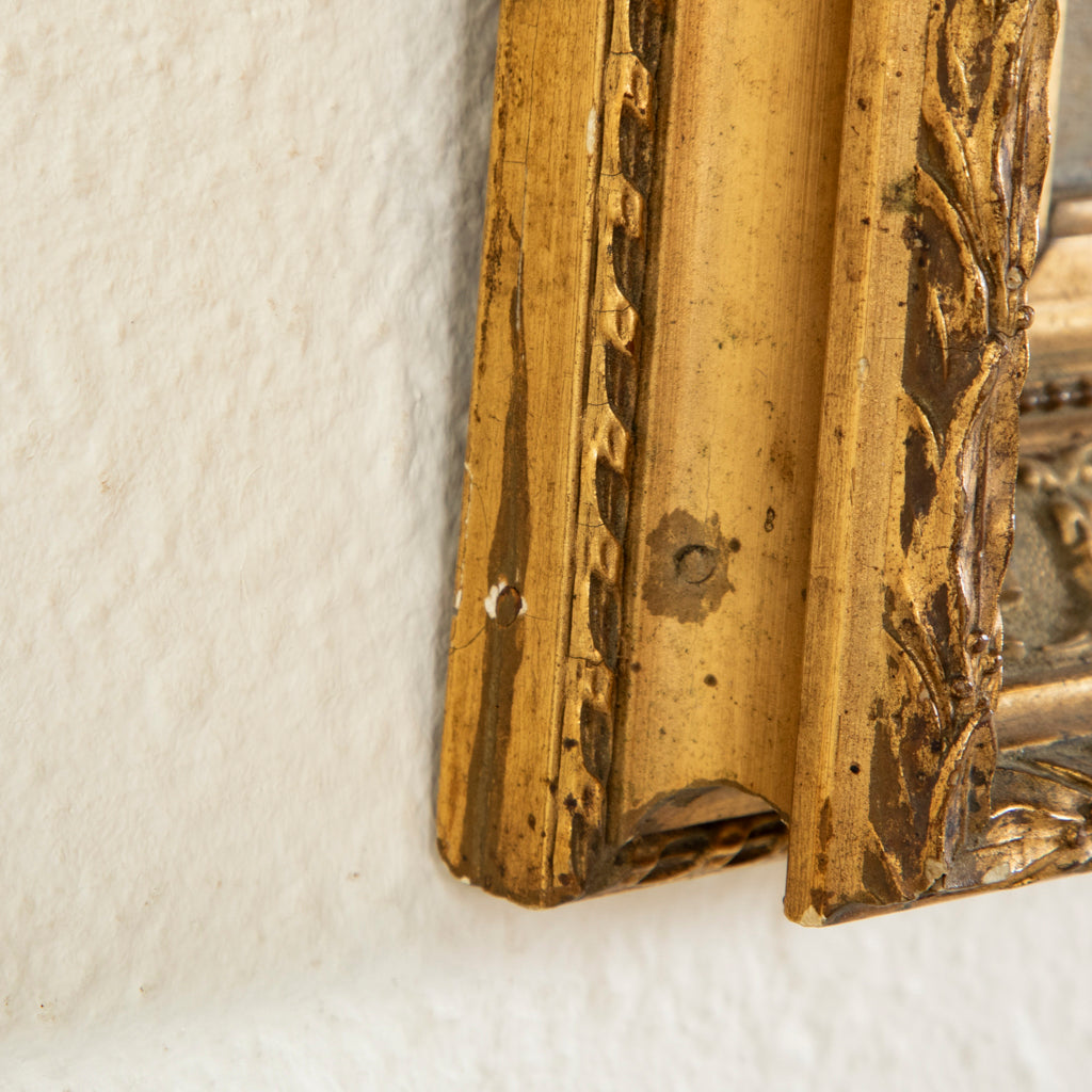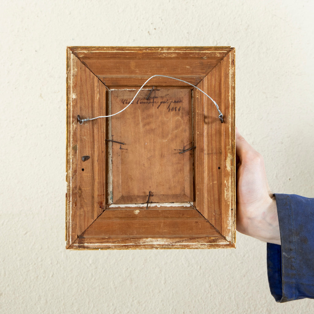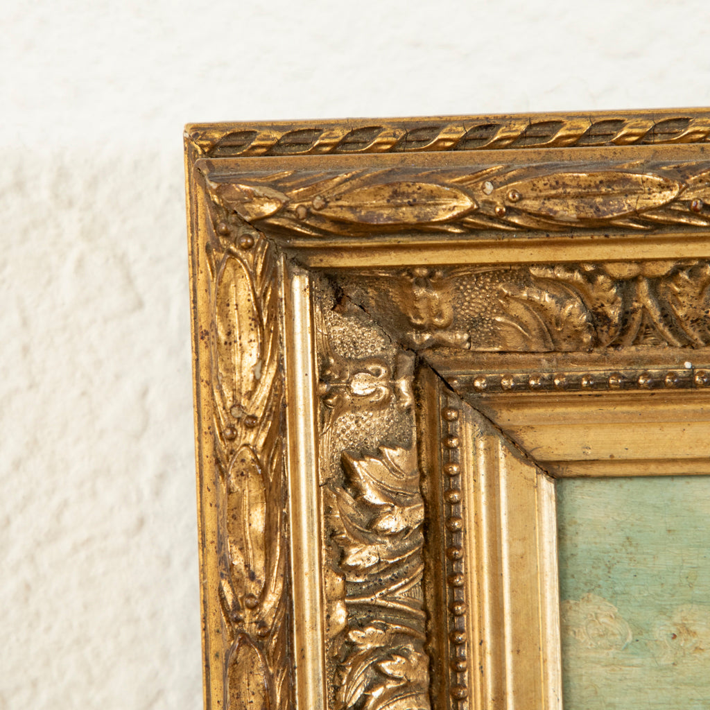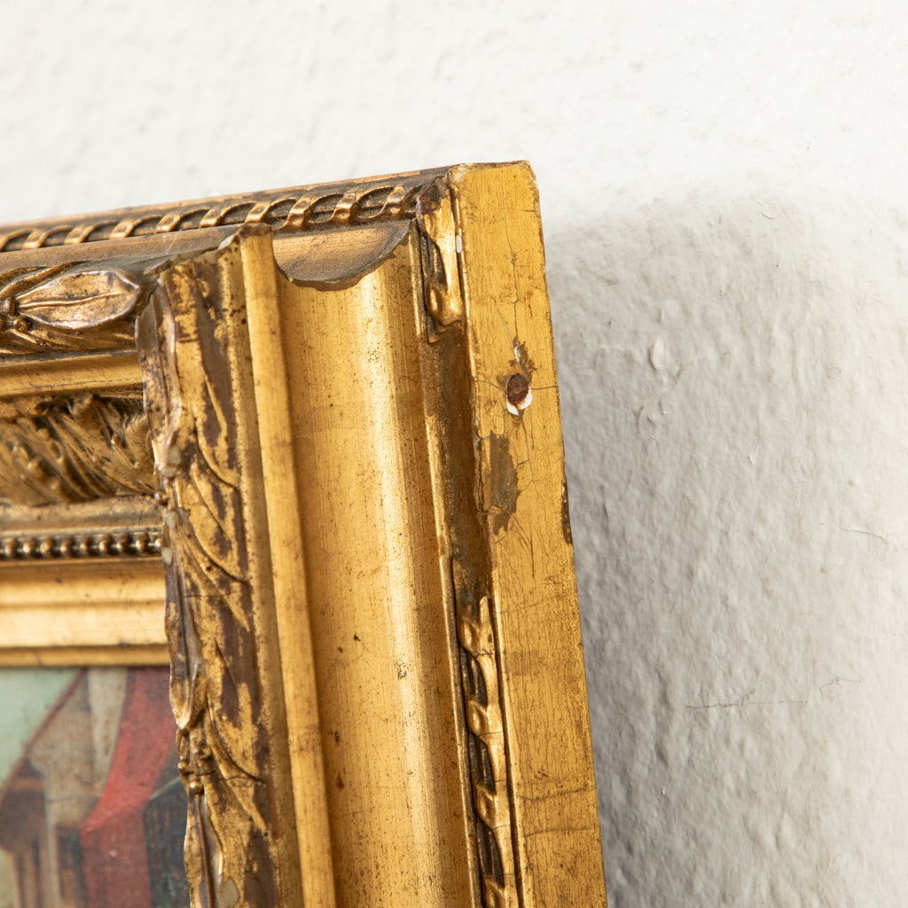 Nineteenth century oil on panel in giltwood frame. Village scene. 9.75" H X 8.25" W framed 5.5" H X 4" W unframed