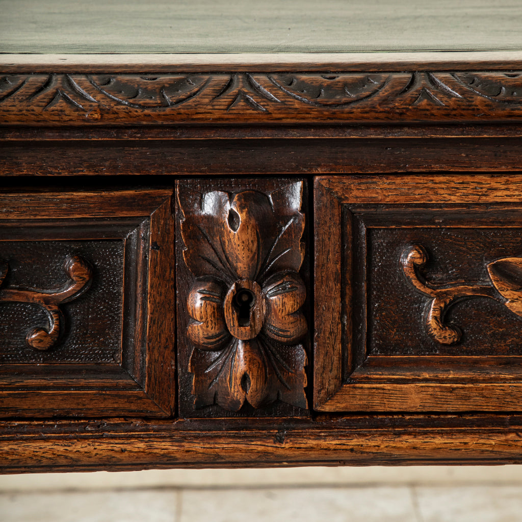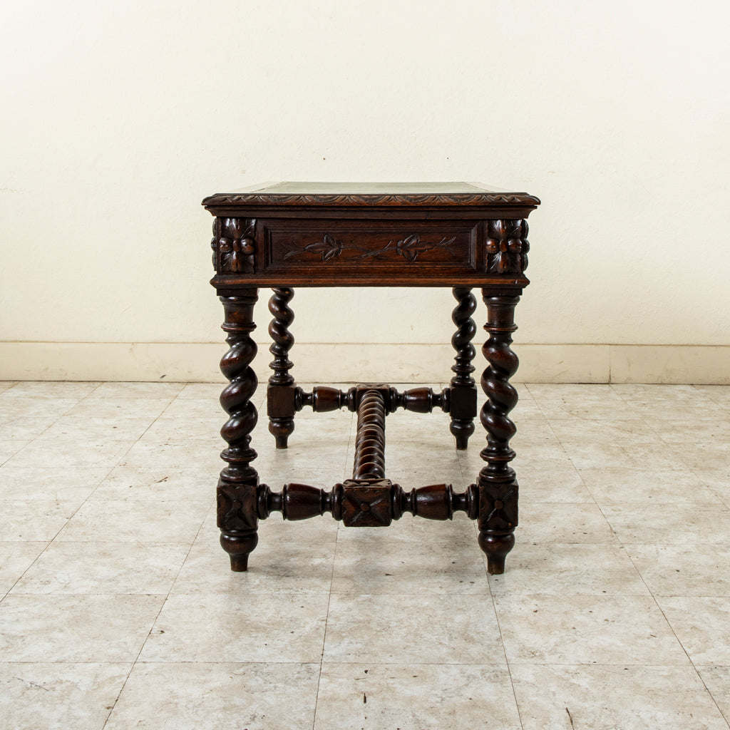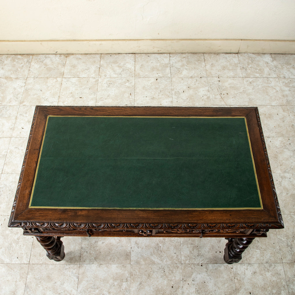 Late nineteenth century hand carved oak Louis XIII style desk with two drawers and green leather top, c. 1880. Carved on all four sides. 29.5" H X 45.25" W...