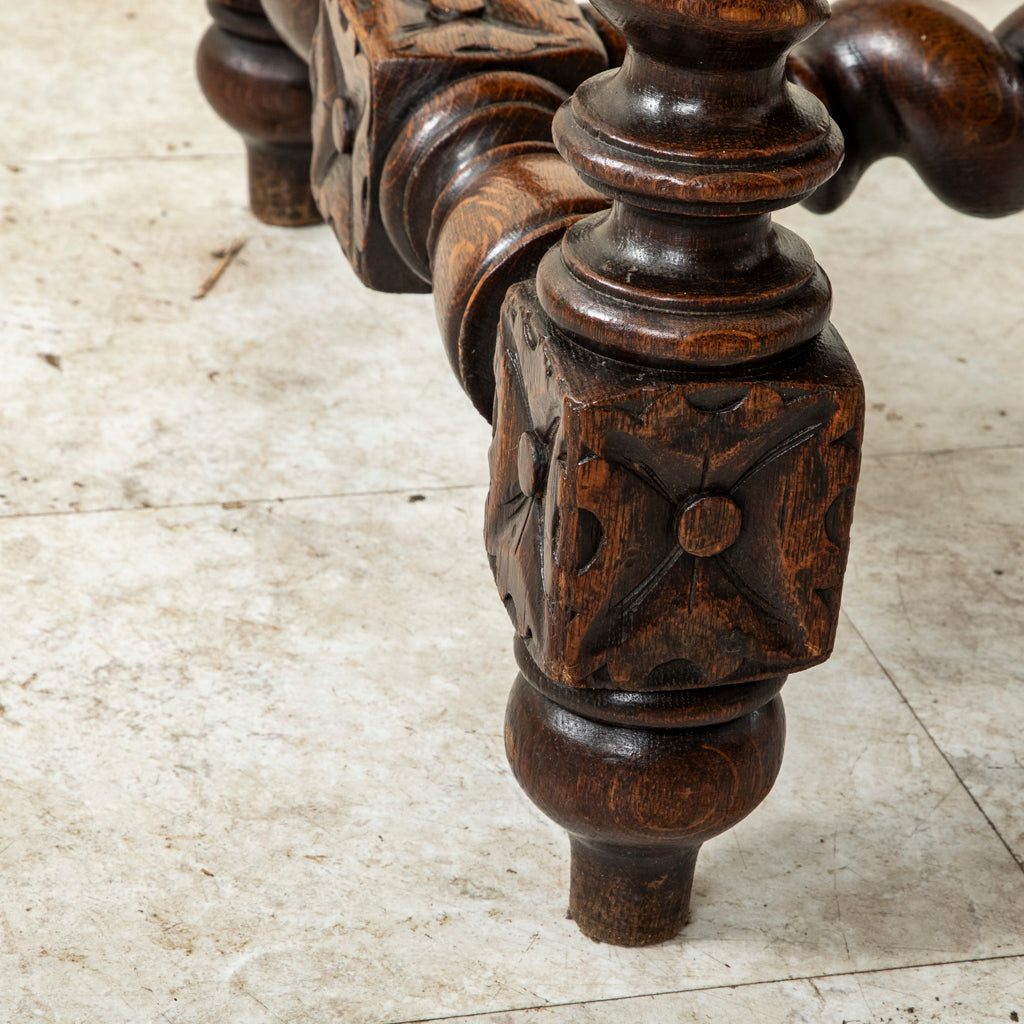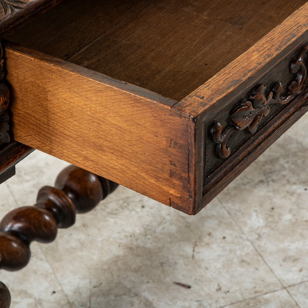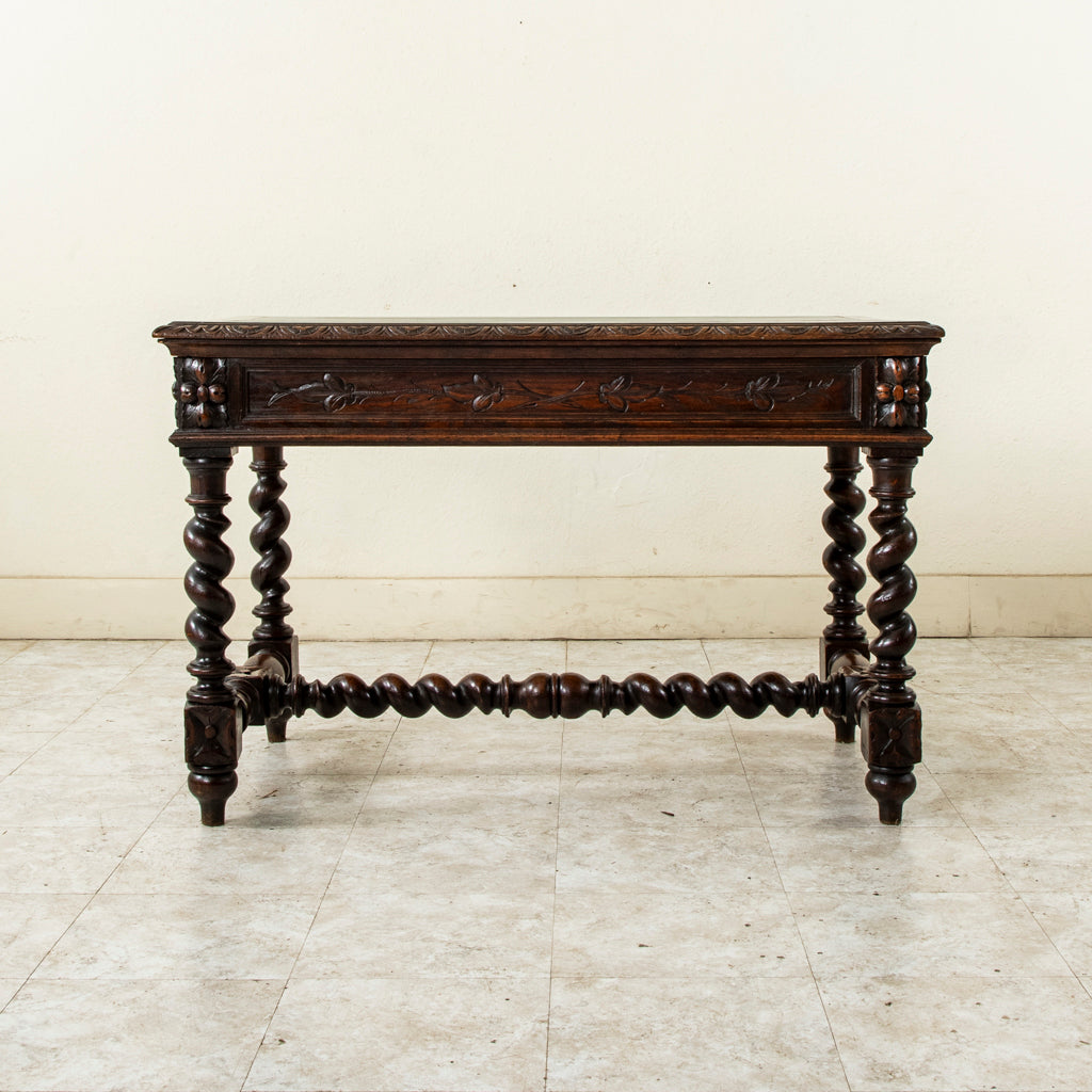 Late nineteenth century hand carved oak Louis XIII style desk with two drawers and green leather top, c. 1880. Carved on all four sides. 29.5" H X 45.25" W...