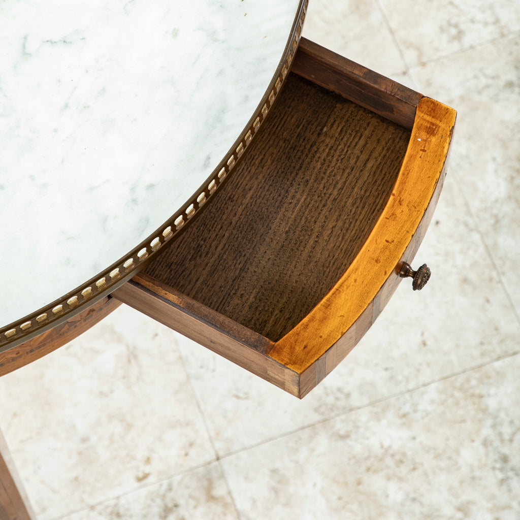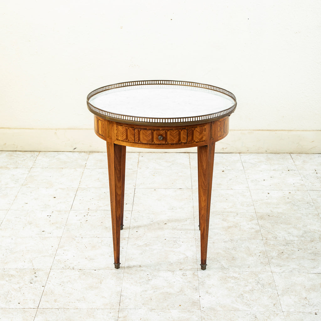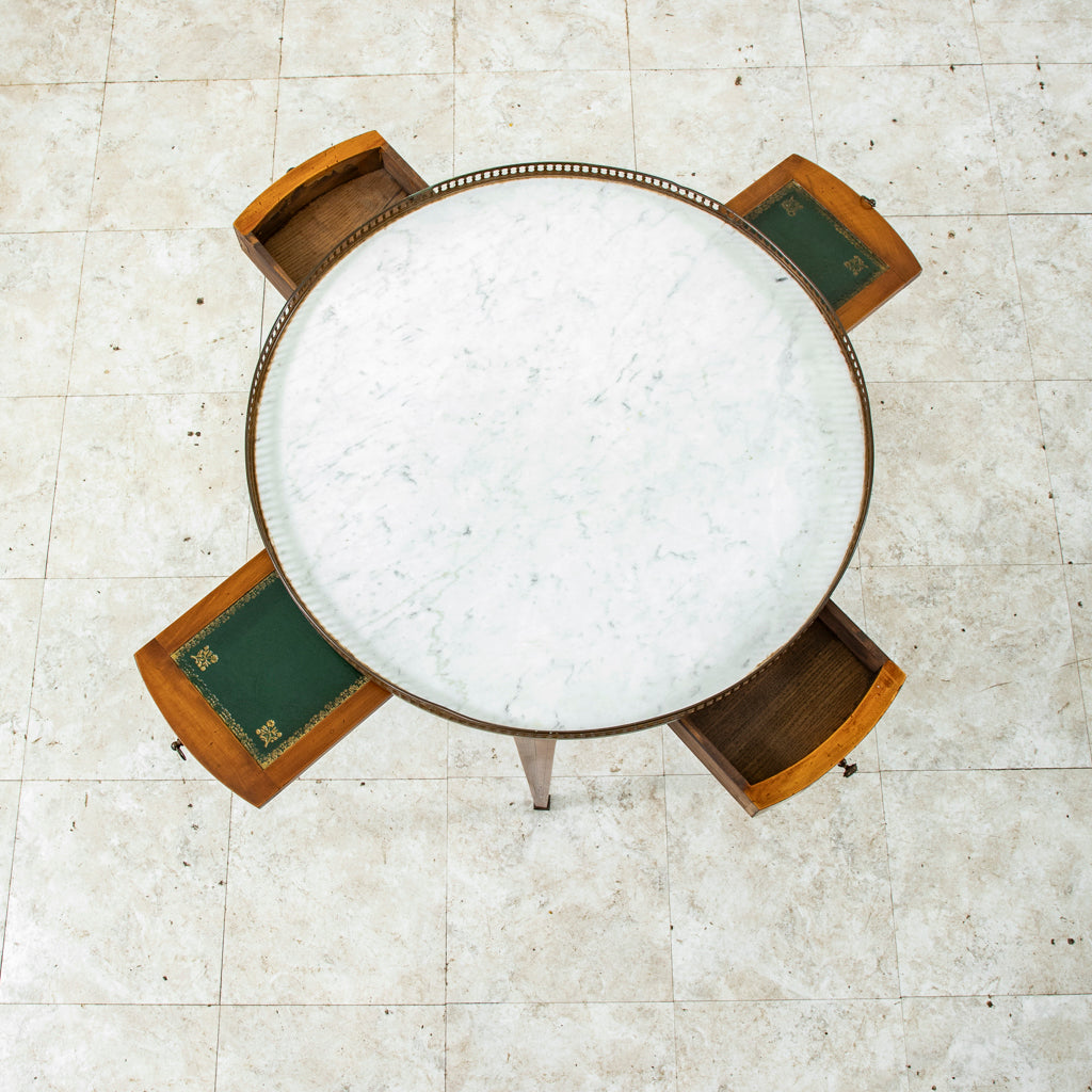 Twentieth century Louis XVI style marquetry table bouillotte with white marble top and bronze gallery. Two drawers and two pull out trays with gold tooled leather tops. Marquetry includes rosewood,...