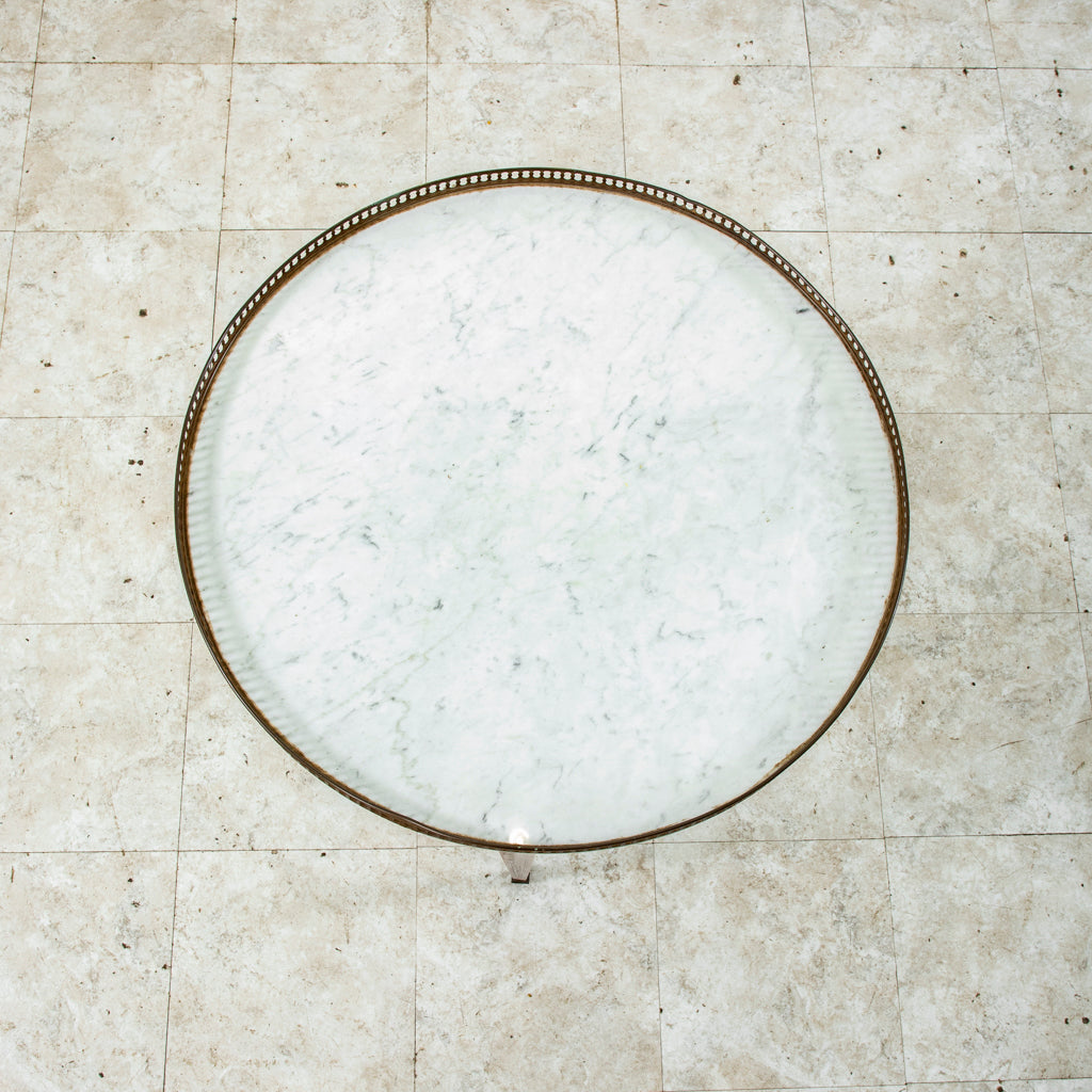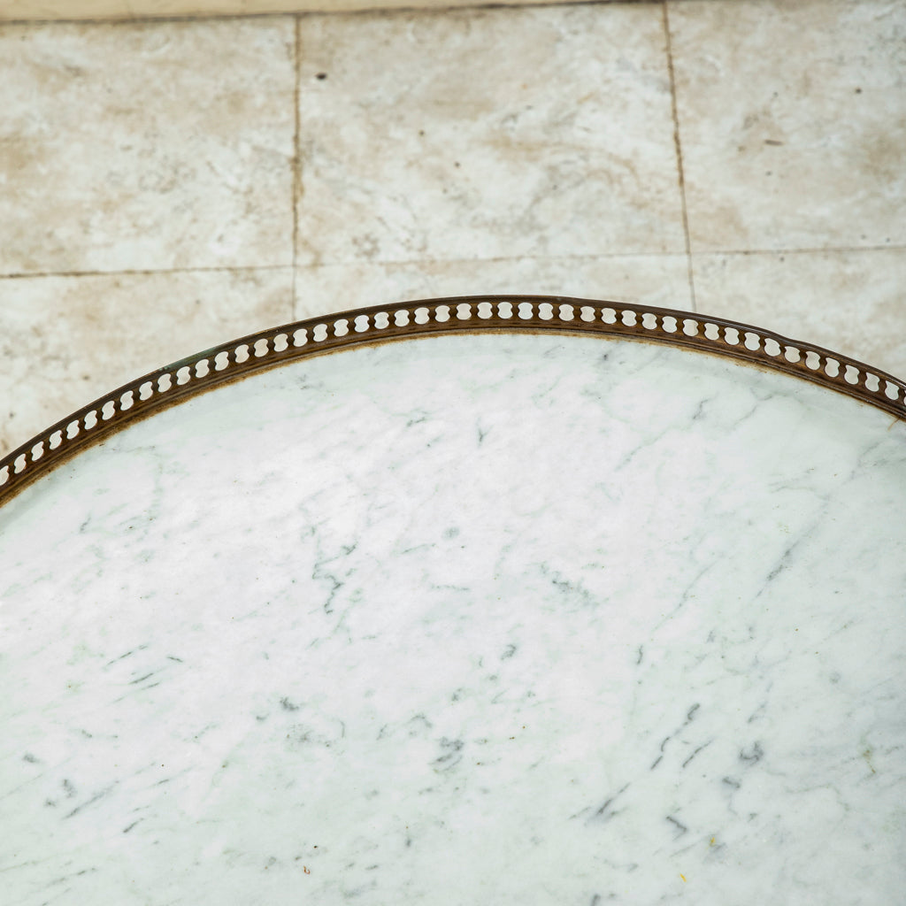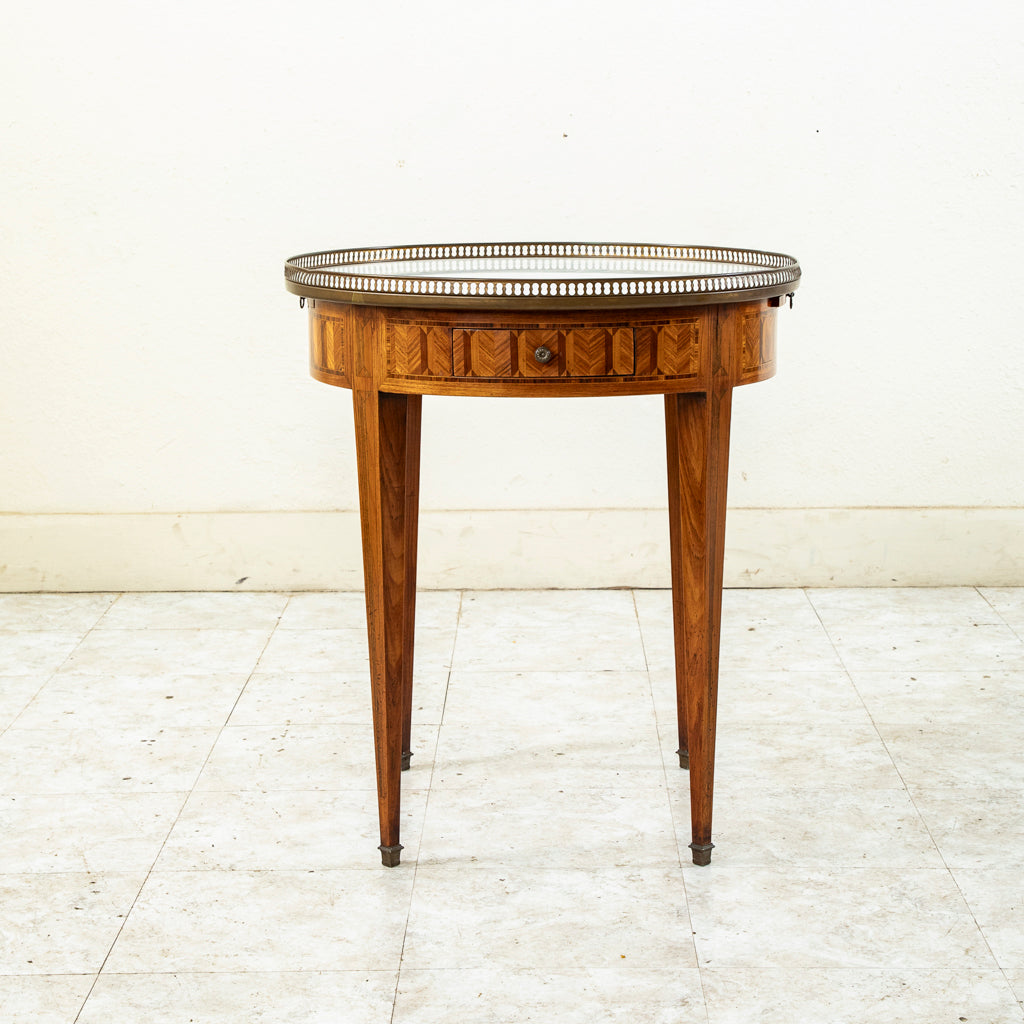 Twentieth century Louis XVI style marquetry table bouillotte with white marble top and bronze gallery. Two drawers and two pull out trays with gold tooled leather tops. Marquetry includes rosewood,...