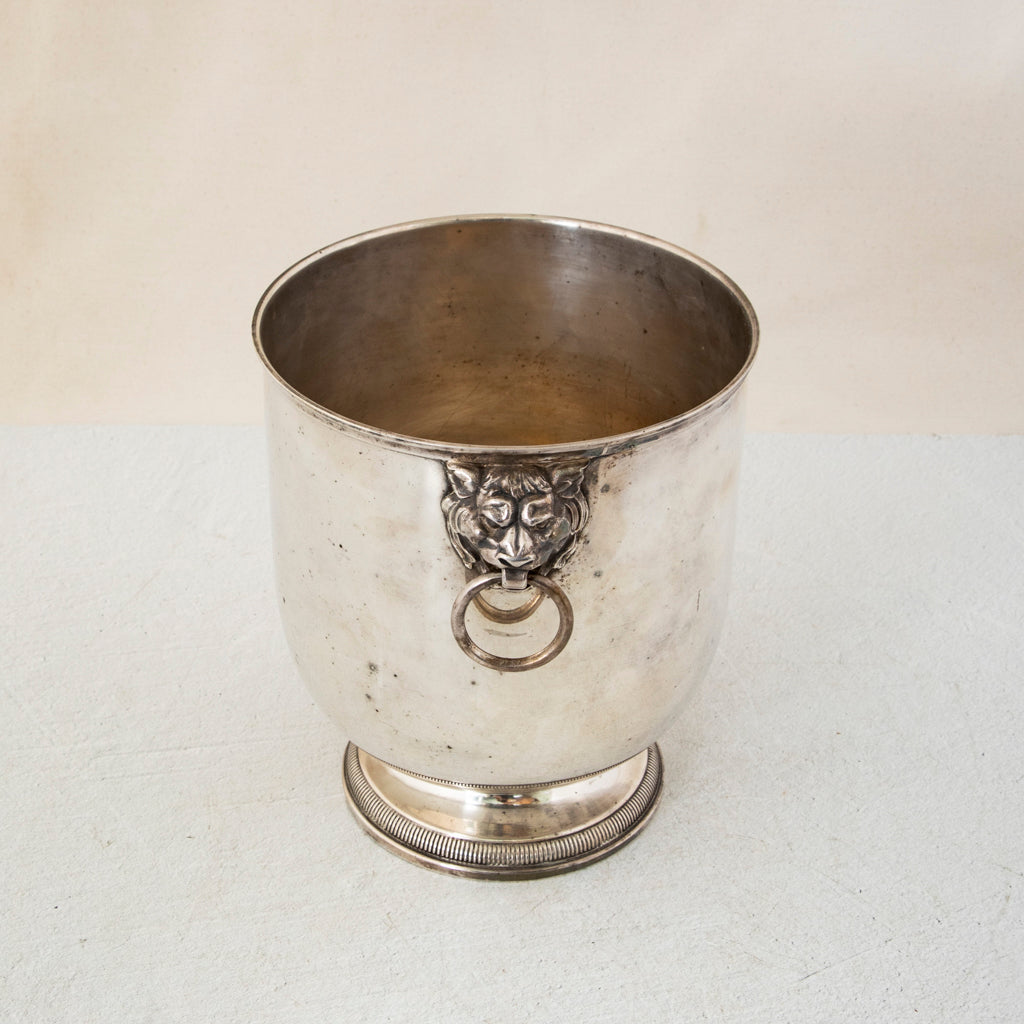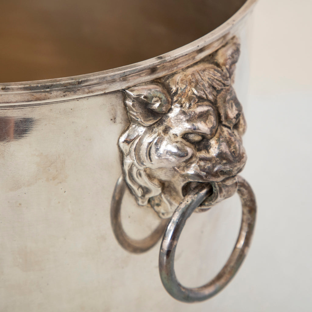 Mid twentieth century silver plate footed champagne bucket with lion heads and drop ring handles. 8.5" H X 7.5" Diameter 9" W with handles
