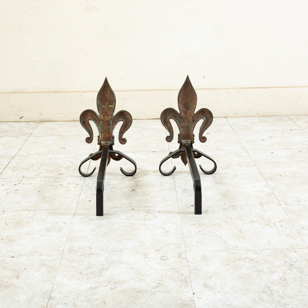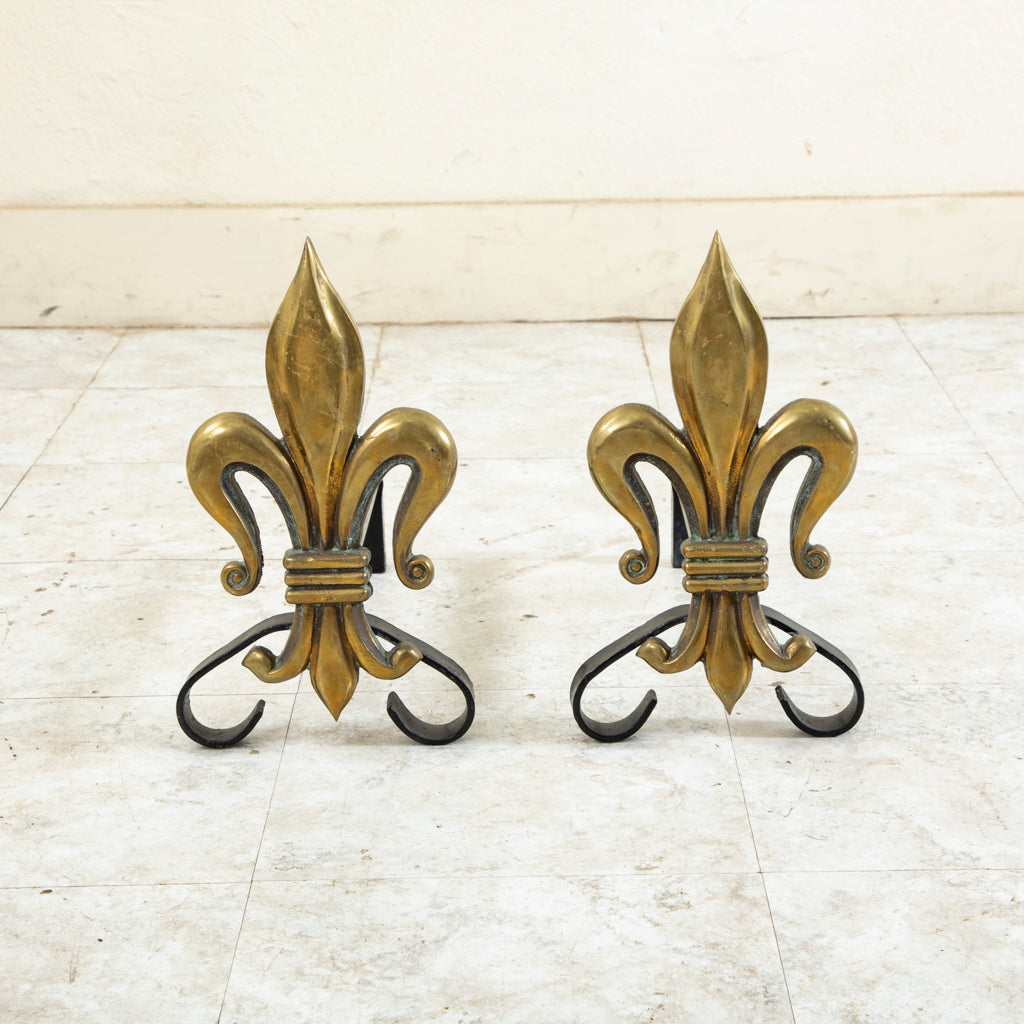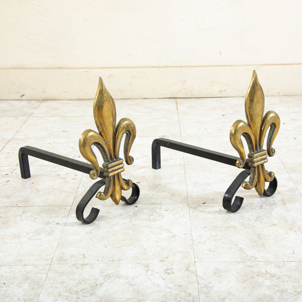 Pair of andirons with bronze fleur de lys. 13.75" H X 8" W X 16" D