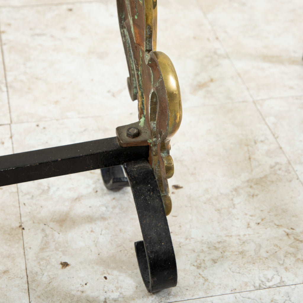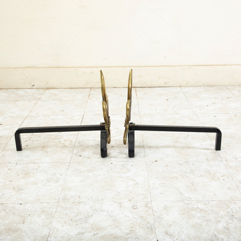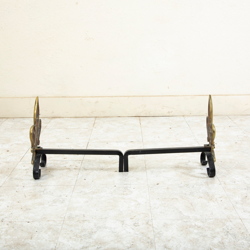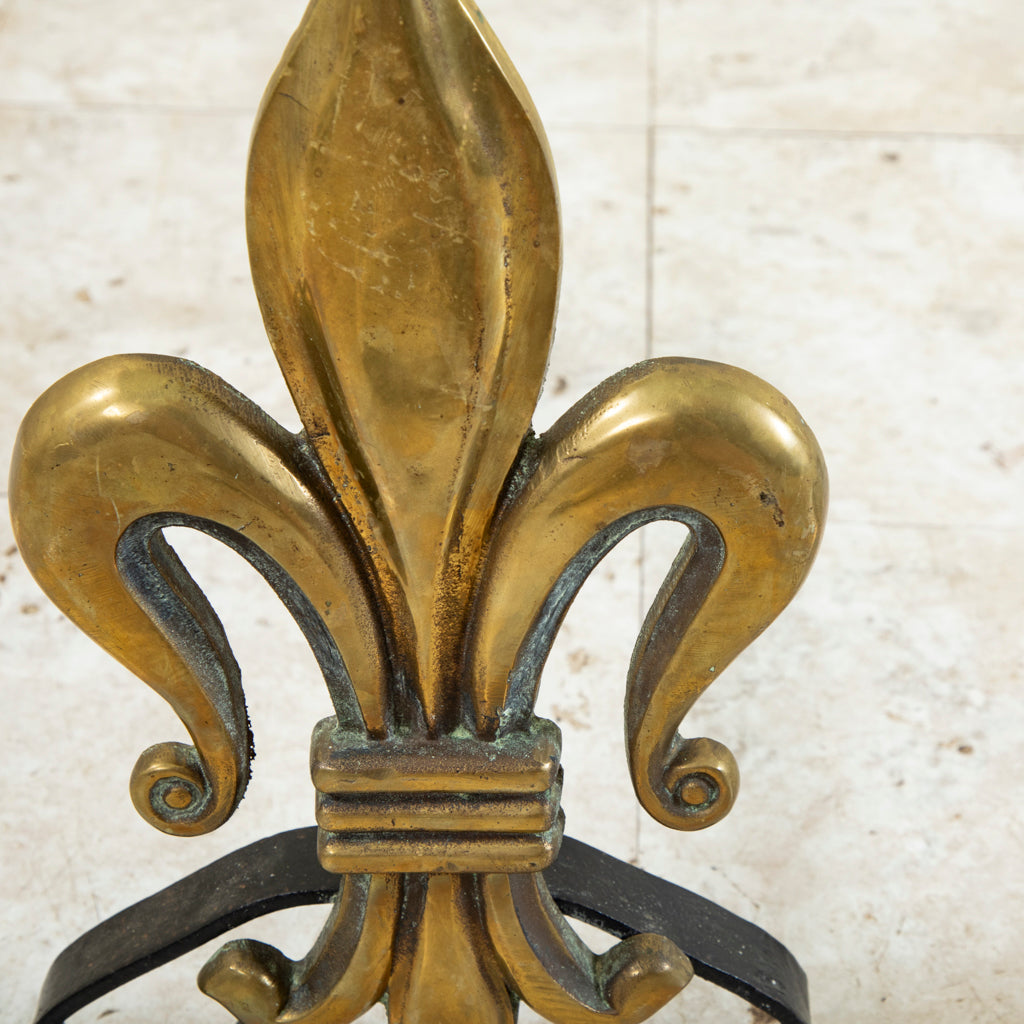 Pair of andirons with bronze fleur de lys. 13.75" H X 8" W X 16" D