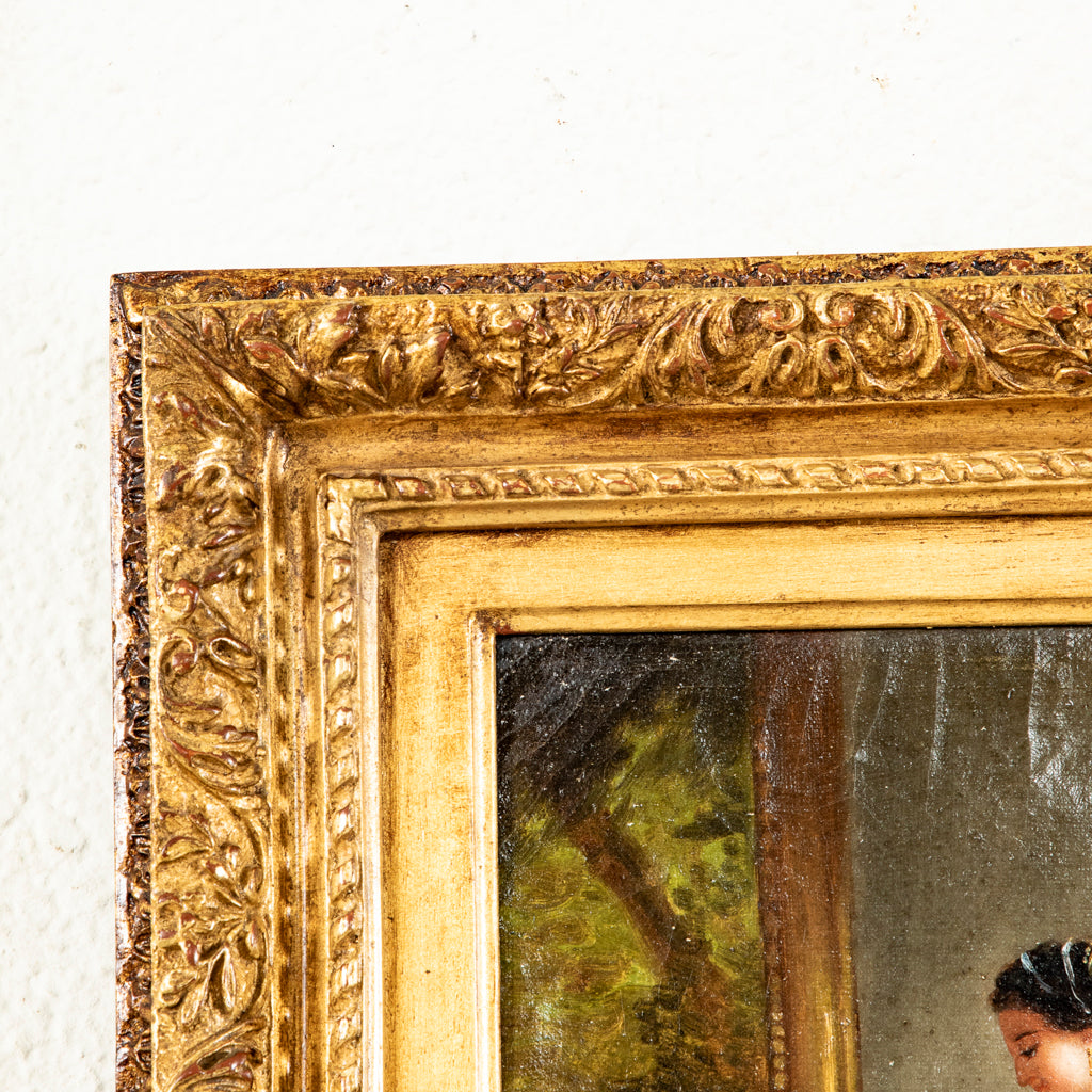 Nineteenth century oil on canvas painting in original gilt wood frame. Young woman reading a letter. Unsigned. 48" H X 28" W framed