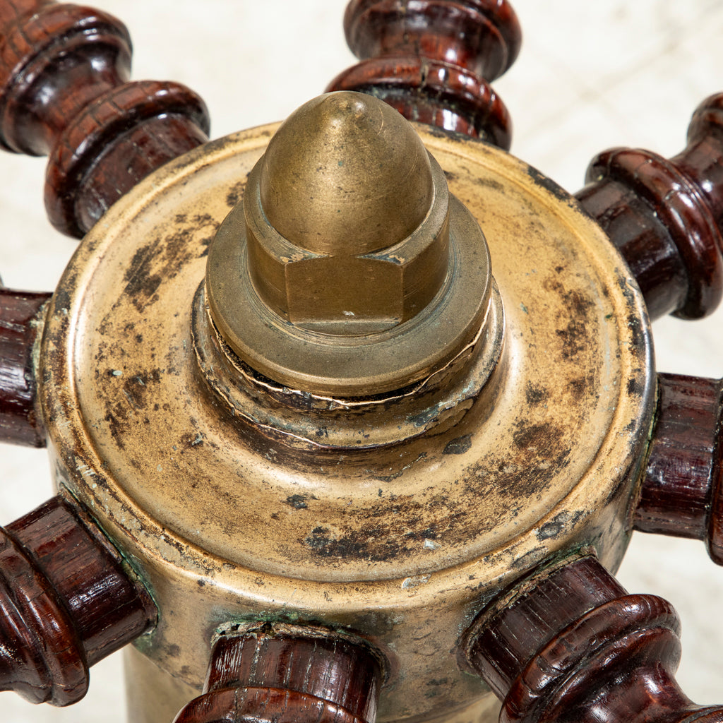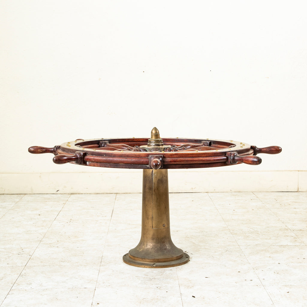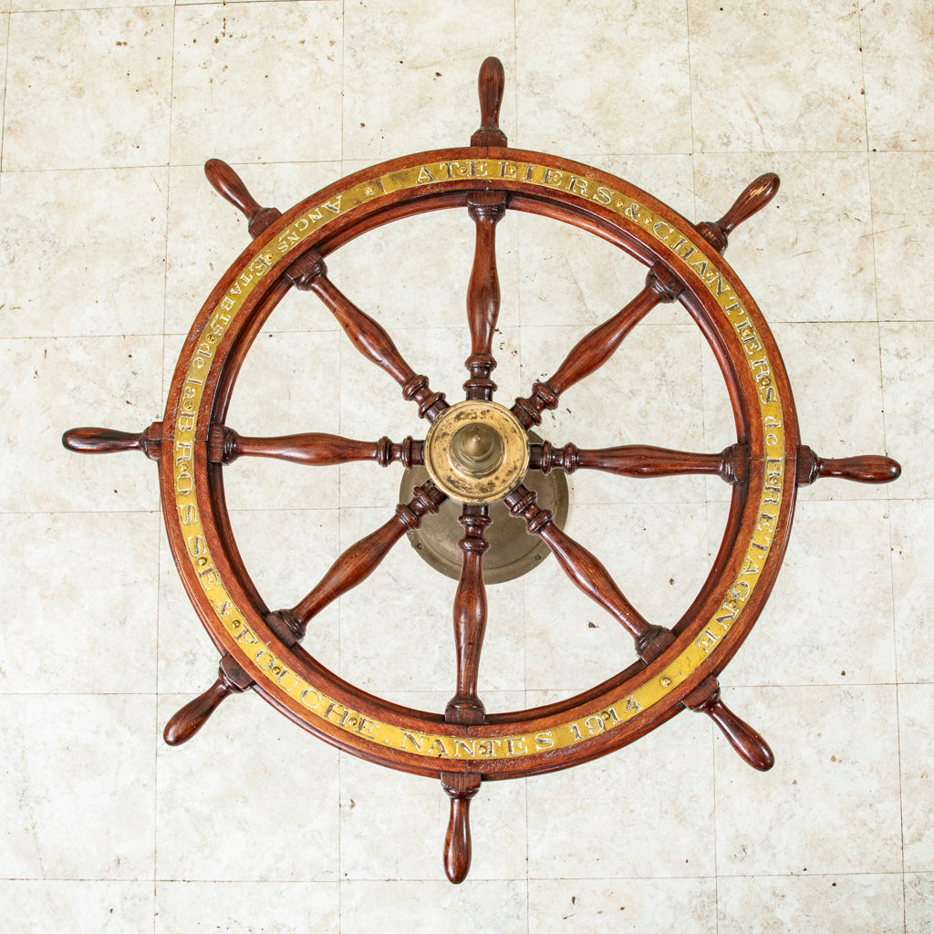 Early twentieth century oak, beechwood, and brass ship's wheel on its original brass helm pedestal. Brass on the wheel is engraved Anciens Etablissements de la Brosse & Fouche, Nantes 1914...