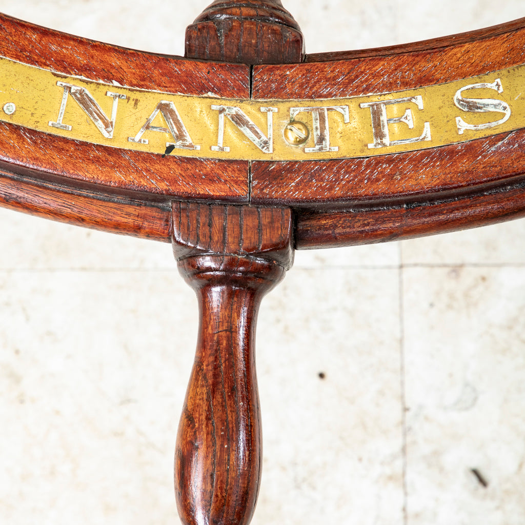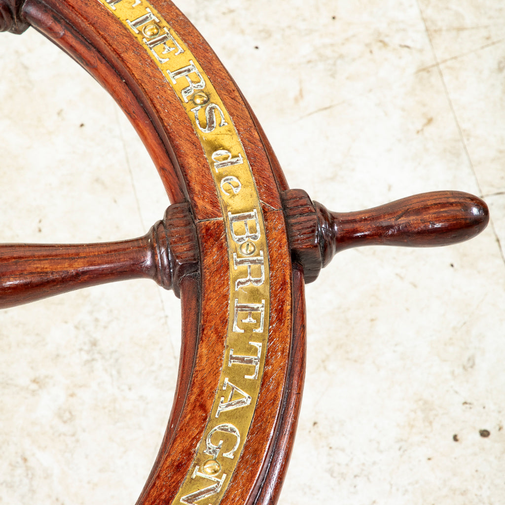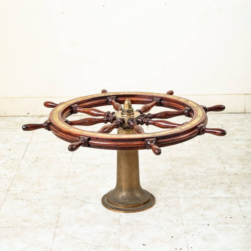 Early twentieth century oak, beechwood, and brass ship's wheel on its original brass helm pedestal. Brass on the wheel is engraved Anciens Etablissements de la Brosse & Fouche, Nantes 1914...